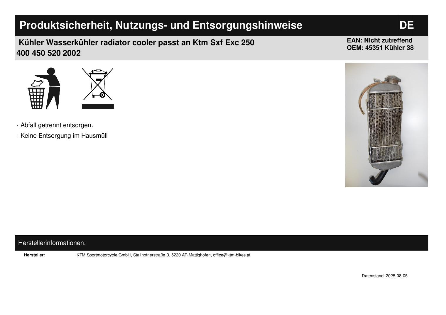 Titel: Kühler Wasserkühler radiator cooler passt an Ktm Sxf Exc 250 400 450 520 2002