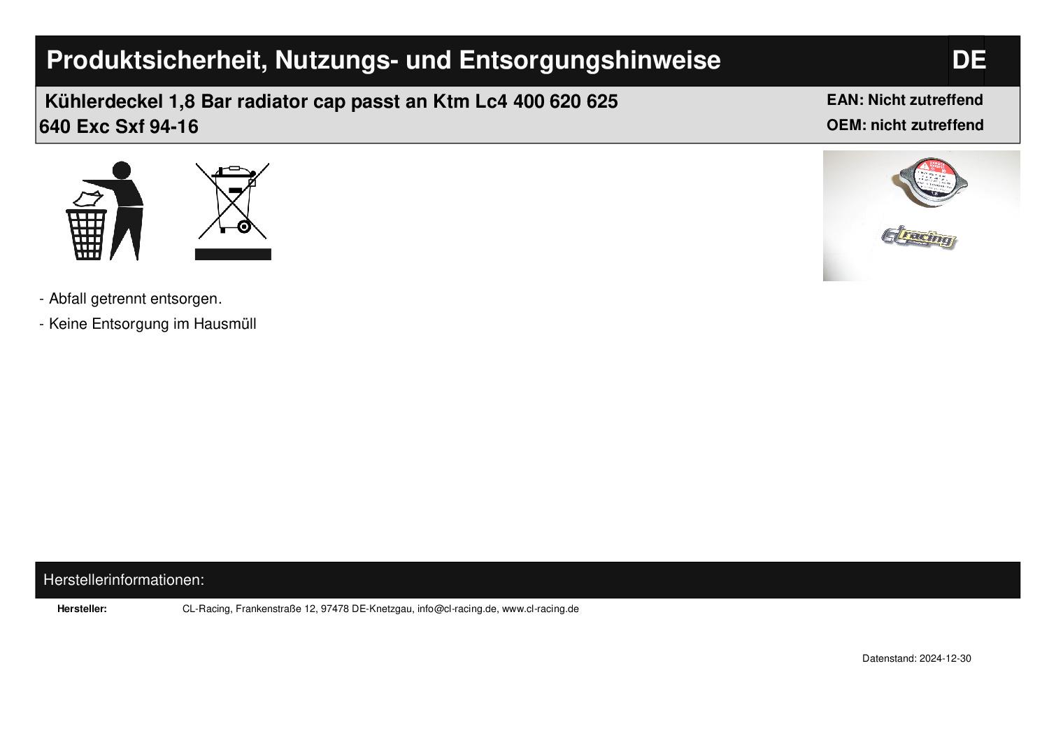 Kühlerdeckel Ktm bis 2016 1,8 Bar - Lager -