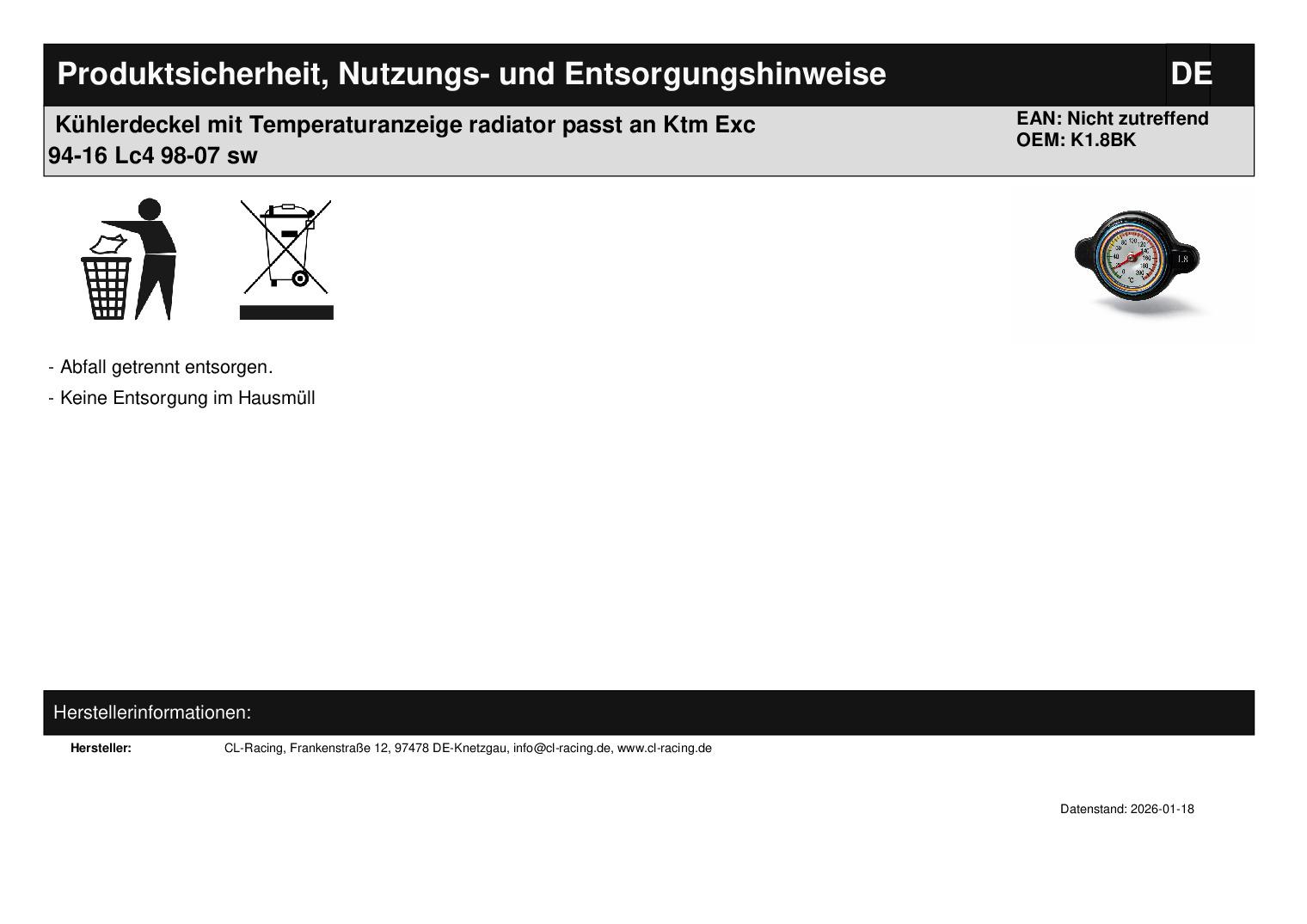 In dieser Auktion gibt es folgenden Artikel zu kaufen: Kühlerdeckel mit Temperaturanzeige (ähnlich Foto) Modell: passend für Ktm EXC, EXC-F, EXC-R, SX, SX-F, Lc2, EGS, GS, MX, MXC 125, 150, 200, 240, 250, 300, 350, 360, 380, 400, 450, 500, 520, 525, 530, 540, 560 Bj.: 1994 - 2016 MX, MXC, XC, XC-F, SMC, SMR 125, 144, 150, 240, 250, 300, 350, 360, 380, 400, 440, 450, 505, 540, 560 Bj.: 2000 - 2015 Lc4, Duke, SMC, SMR, SXC, SC, SX 350, 400, 540, 600, 612, 620, 625, 640 660 Bj.: 1998 - 2007 Details: - 1,8 bar - 0 - 200° C - inkl. Überdruckventil - Plug & Play bei originalem Kühler - Höhe von Dichtfläche zu Dichtfläche: ca. 20mm - Dichtfläche klein: Ø 25mm Dichtfläche groß: Ø 39mm Lieferumfang: 1 Stück Artikelzustand: neu Es handelt sich hierbei um kein Originalteil! Bei Unklarheiten oder Fragen bitte erst E-Mail schreiben.