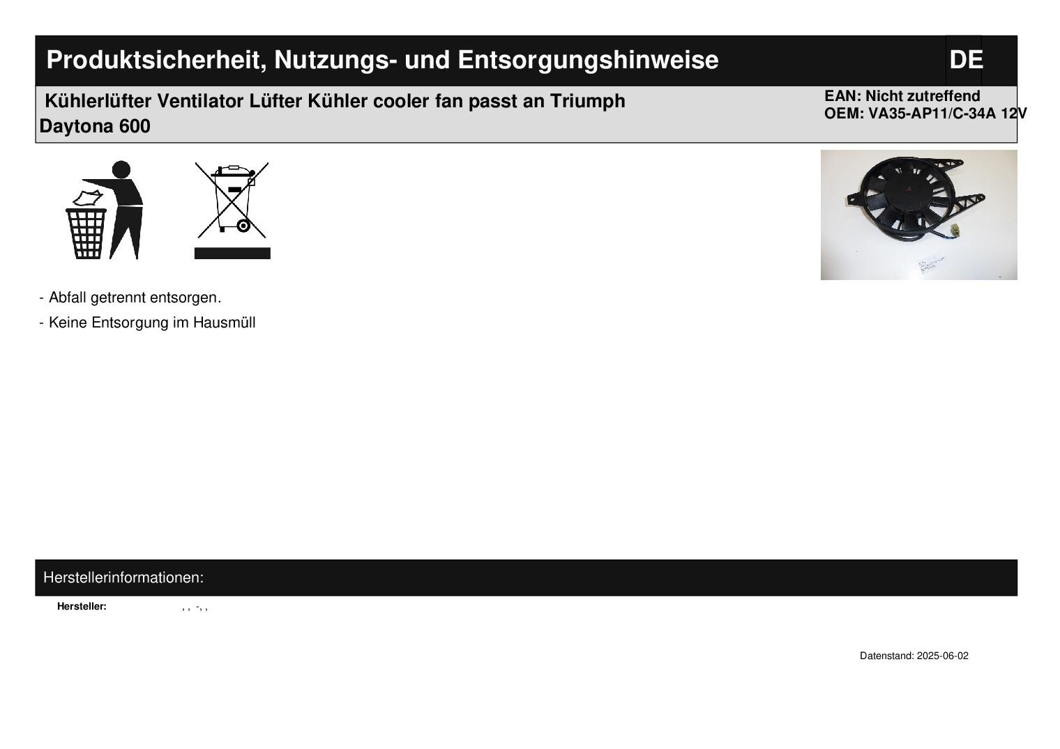 In dieser Auktion gibt es folgenden Artikel zu kaufen: originaler Kühlerlüfter (siehe Foto) Fahrzeug: passend für Triumph Daytona 600 Erstzulassung: 03.2005 (passt evtl. auch für andere Modelle, bitte erst nachfragen!) Lieferumfang: siehe Foto Artikelzustand: normale Gebrauchsspuren vorhanden; Kühlerlüfter funktionierte bis zur Demontage problemlos; Zustand siehe Foto Bei Unklarheiten oder Fragen bitte erst E-Mail schreiben.