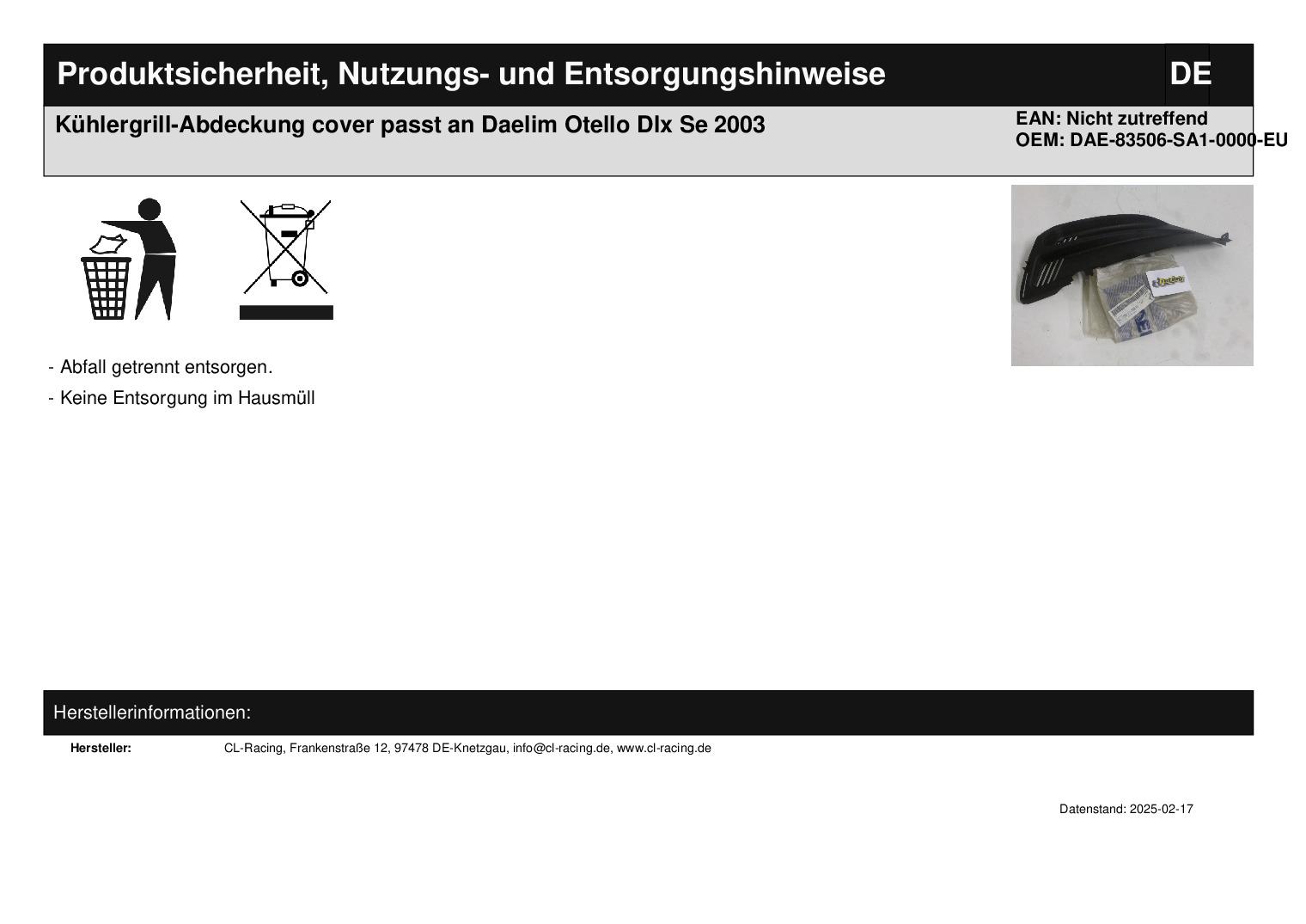 In dieser Auktion gibt es folgenden Artikel zu kaufen: Kühlergrill-Abdeckung (siehe Foto) Modell: passend für Daelim Otello DLX Bj.: 03 Otello SE Bj.: 06 Lieferumfang: siehe Foto Artikelzustand: neu aus Geschäftsauflösung, mit leichten Lagerspuren; Zustand siehe Foto Bei Unklarheiten oder Fragen bitte erst E-Mail schreiben.