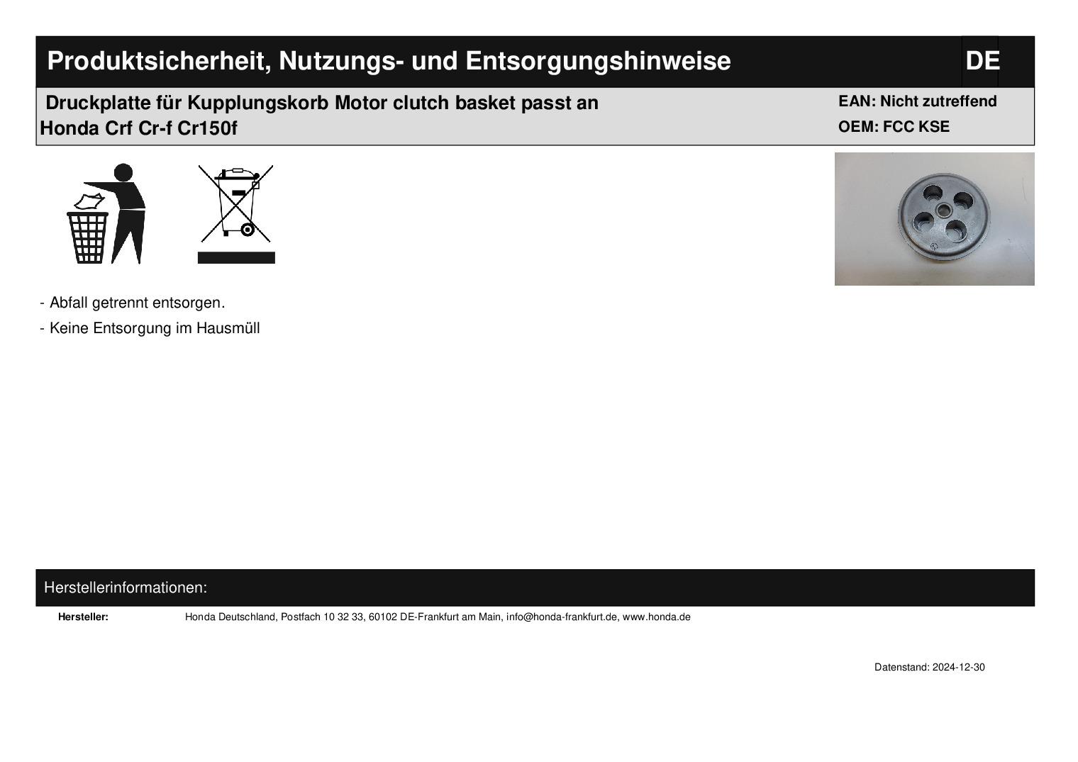 In dieser Auktion gibt es folgenden Artikel zu kaufen: Druckplatte (siehe Foto) Modell: passend für Honda Crf 150 (4-Takt) Bj.: --- (evtl. auch für andere Modelle) Teilenummer: FCC KSE (steht auf der Innenseite) Lieferumfang: siehe Foto Artikelzustand: normale Gebrauchsspuren vorhanden; Zustand siehe Foto Weitere Teile auf Anfrage Bei Unklarheiten oder Fragen bitte erst E-Mail schreiben.