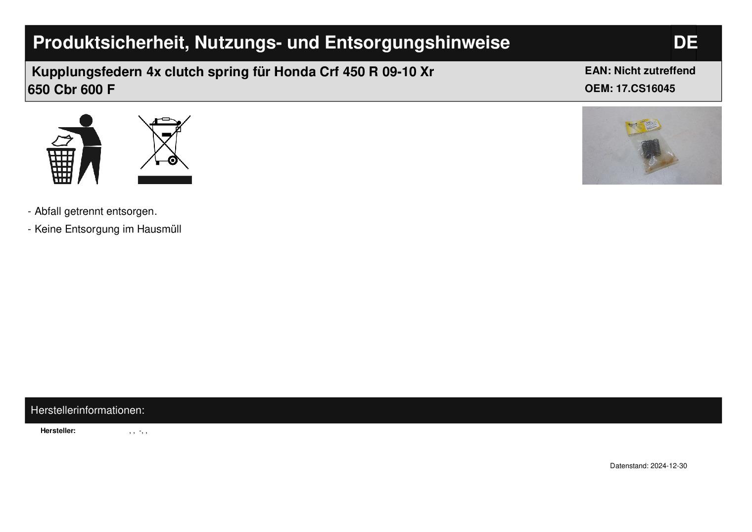 In dieser Auktion gibt es folgenden Artikel zu kaufen: Kupplungsfedern (siehe Foto) Modell: passend für Honda CRF 450 R Bj.: 09 - 10 XR 600 L Bj.: 83 XR 650 R Bj.: 00 - 07 CBR 600 F Bj.: 91 - 98 Lieferumfang: 4 Stück Artikelzustand: neu aus Geschäftsauflösung, mit minimalen Lagerspuren; Zustand siehe Foto Bei Unklarheiten oder Fragen bitte erst E-Mail schreiben.
