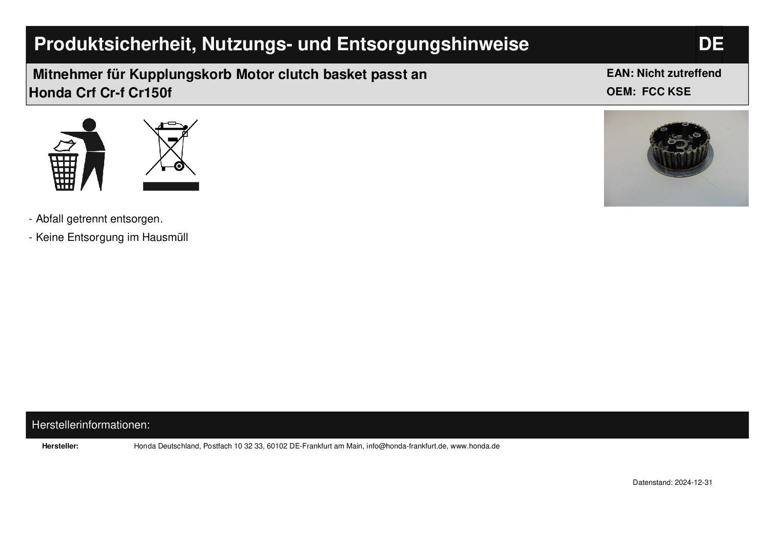 In dieser Auktion gibt es folgenden Artikel zu kaufen: Mitnehmer (siehe Foto) Modell: passend für Honda Crf 150 (4-Takt) Bj.: unbekannt (evtl. auch für andere Modelle) Teilenummer: FCC KSE (steht auf der Innenseite) Lieferumfang: siehe Foto Artikelzustand: normale Gebrauchsspuren sowie leichte Rattermarken an den Flanken vorhanden; Zustand siehe Foto Weitere Teile auf Anfrage Bei Unklarheiten oder Fragen bitte erst E-Mail schreiben.