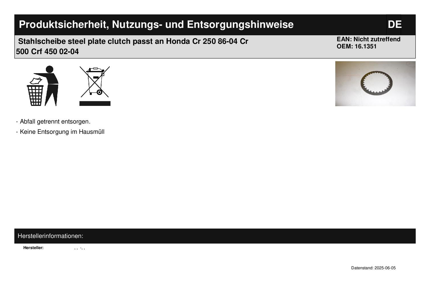 In dieser Auktion gibt es folgenden Artikel zu kaufen: Stahlscheibe (ähnlich Foto) Modell: passend für Honda CR 250 Bj.: 86 - 04 CR 500 Bj.: 84 - 01 CRF 450 R Bj.: 02 - 04 Lieferumfang: 1 Stück Artikelzustand: neu aus Geschäftsauflösung, mit leichten Lagerspuren wie z. B. Flugrost; Zustand ähnlich Foto Bei Unklarheiten oder Fragen bitte erst E-Mail schreiben.