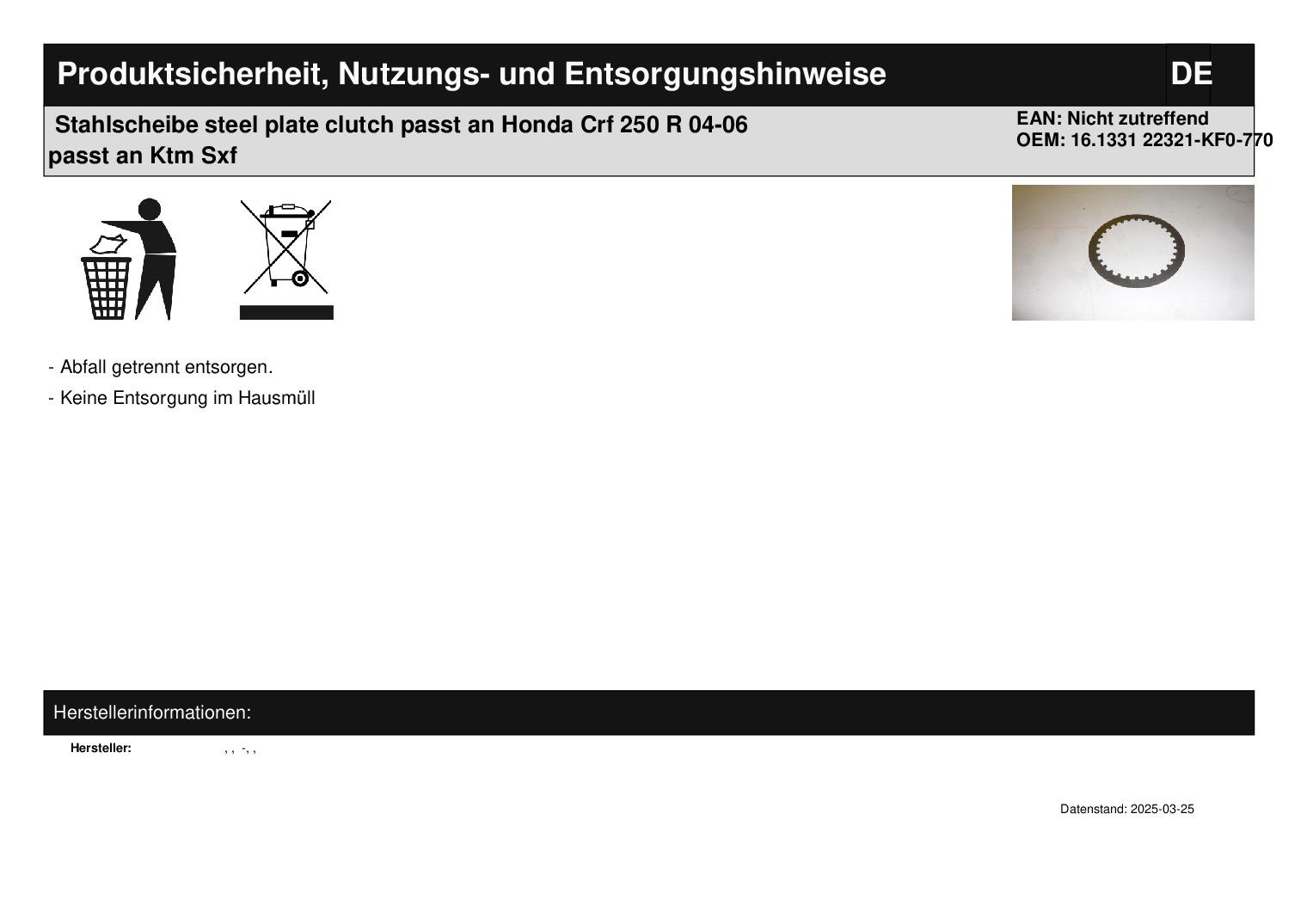 In dieser Auktion gibt es folgenden Artikel zu kaufen: Stahlscheibe (ähnlich Foto) Modell: passend für Honda CRF 250 R Bj.: 04 - 06 passend für Ktm SXF 250 Bj.: 06 Lieferumfang: 1 Stück Artikelzustand: neu aus Geschäftsauflösung, mit leichten Lagerspuren wie z. B. Flugrost; Zustand ähnlich Foto Hierbei handelt es sich um kein Originalteil! Bei Unklarheiten oder Fragen bitte erst E-Mail schreiben.