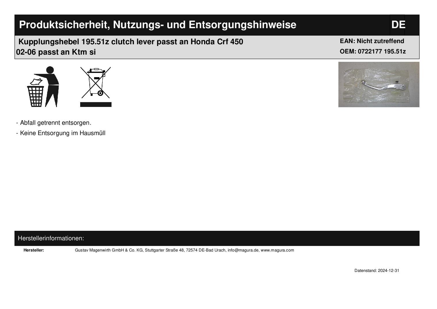 In dieser Auktion gibt es folgenden Artikel zu kaufen: Kupplungshebel (siehe Foto) Modell: passend für Honda CRF 450 R Bj.: 02 - 06 passend für Ktm EXC 450 Bj.: 03 - 05 SXF 450 Bj.: 03 - 05 EXC 525 Bj.: 03 - 05 SX 525 Bj.: 03 - 05 passend für Yamaha YZ 250 Bj.: 05 YZF 450 Bj.: 05 Abmaße: Hebellänge: ca 170 mm Bitte vor dem Kauf vergleichen! Lieferumfang: siehe Foto Artikelzustand: neu aus Geschäftsauflösung, mit leichten Lagerspuren; Zustand siehe Foto Bei Unklarheiten oder Fragen bitte erst E-Mail schreiben. Es handelt sich hierbei um kein Originalteil
