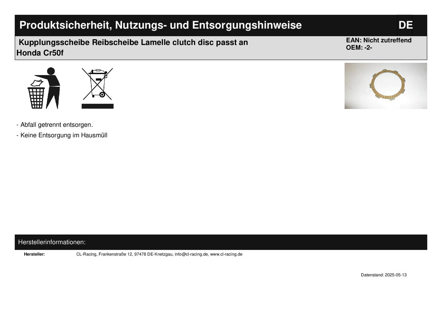 In dieser Auktion gibt es folgenden Artikel zu kaufen: Kupplungsscheibe (siehe Foto) Fahrzeug: passend für Honda Crf 150 (4-Takt) Bj.: unbekannt Lieferumfang: siehe Foto Artikelzustand: neu aus Geschäftsauflösung, mit leichten Lagerspuren; Zustand siehe Foto Bei Unklarheiten oder Fragen bitte erst E-Mail schreiben.