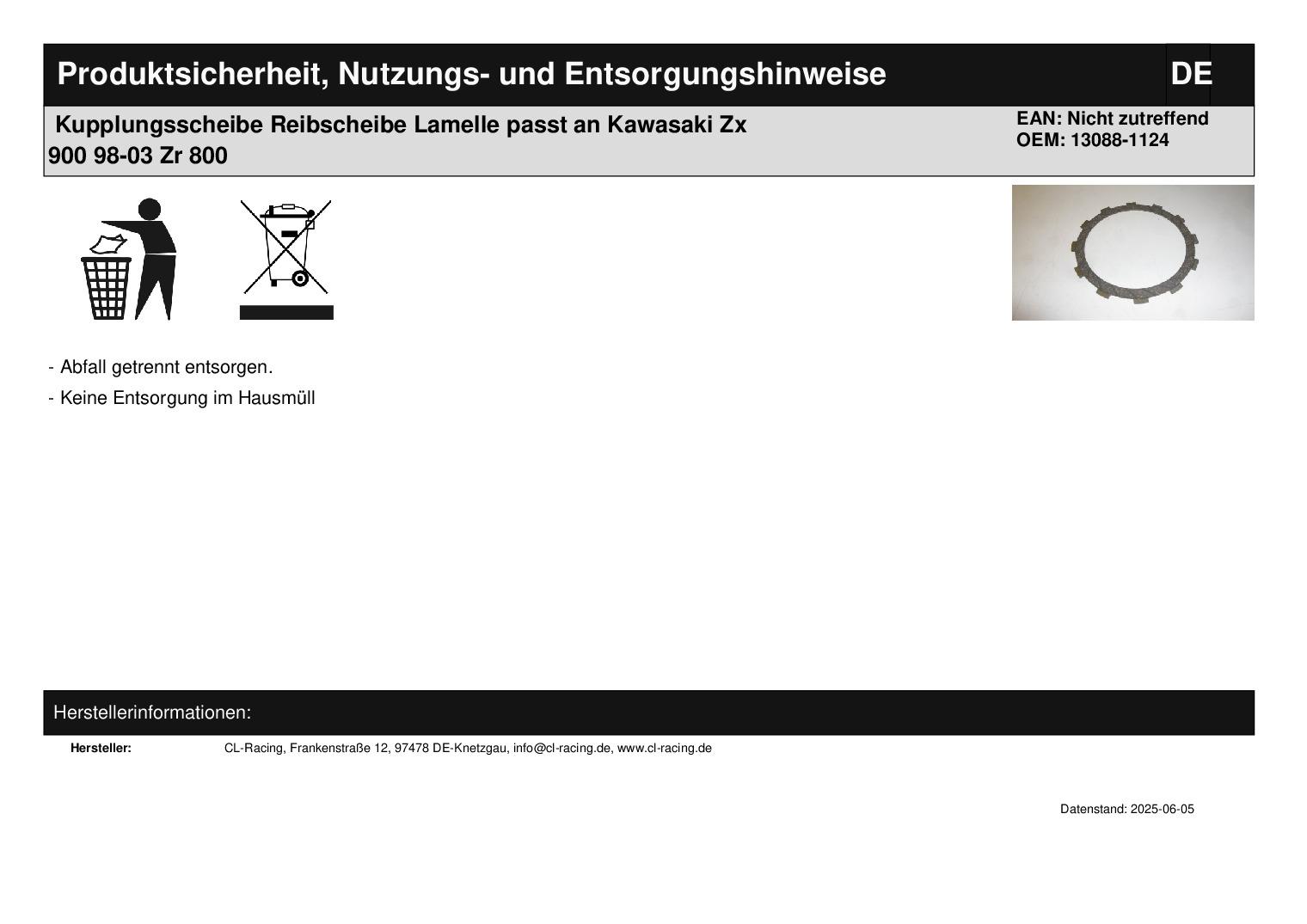 In dieser Auktion gibt es folgenden Artikel zu kaufen: Kupplungsscheibe (siehe Foto) Modell: passend für Kawasaki ZR 800 Bj.: 13 - 16 ZX 600 Bj.: 95 - 04 ZX 900 Bj.: 98 - 03 Lieferumfang: 1 Stück Artikelzustand: neu aus Geschäftsauflösung, mit minimalen Lagerspuren; Zustand siehe Foto Bei Unklarheiten oder Fragen bitte erst E-Mail schreiben.