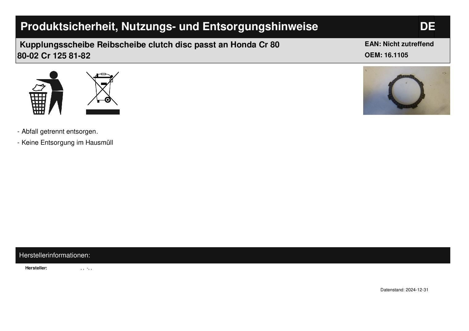 In dieser Auktion gibt es folgenden Artikel zu kaufen: Kupplungsscheibe (siehe Foto) Modell: passend für Honda CR 80 Bj.: 80 - 02 CR 125 Bj.: 81 - 82 passend für Kawasaki KX 80 Bj.: 98 - 00 KX 85 Bj.: 01 Lieferumfang: 1 Stück Artikelzustand: neu aus Geschäftsauflösung, mit leichten Lagerspuren wie z. B. Flugrost; Zustand ähnlich Foto Bei Unklarheiten oder Fragen bitte erst E-Mail schreiben.