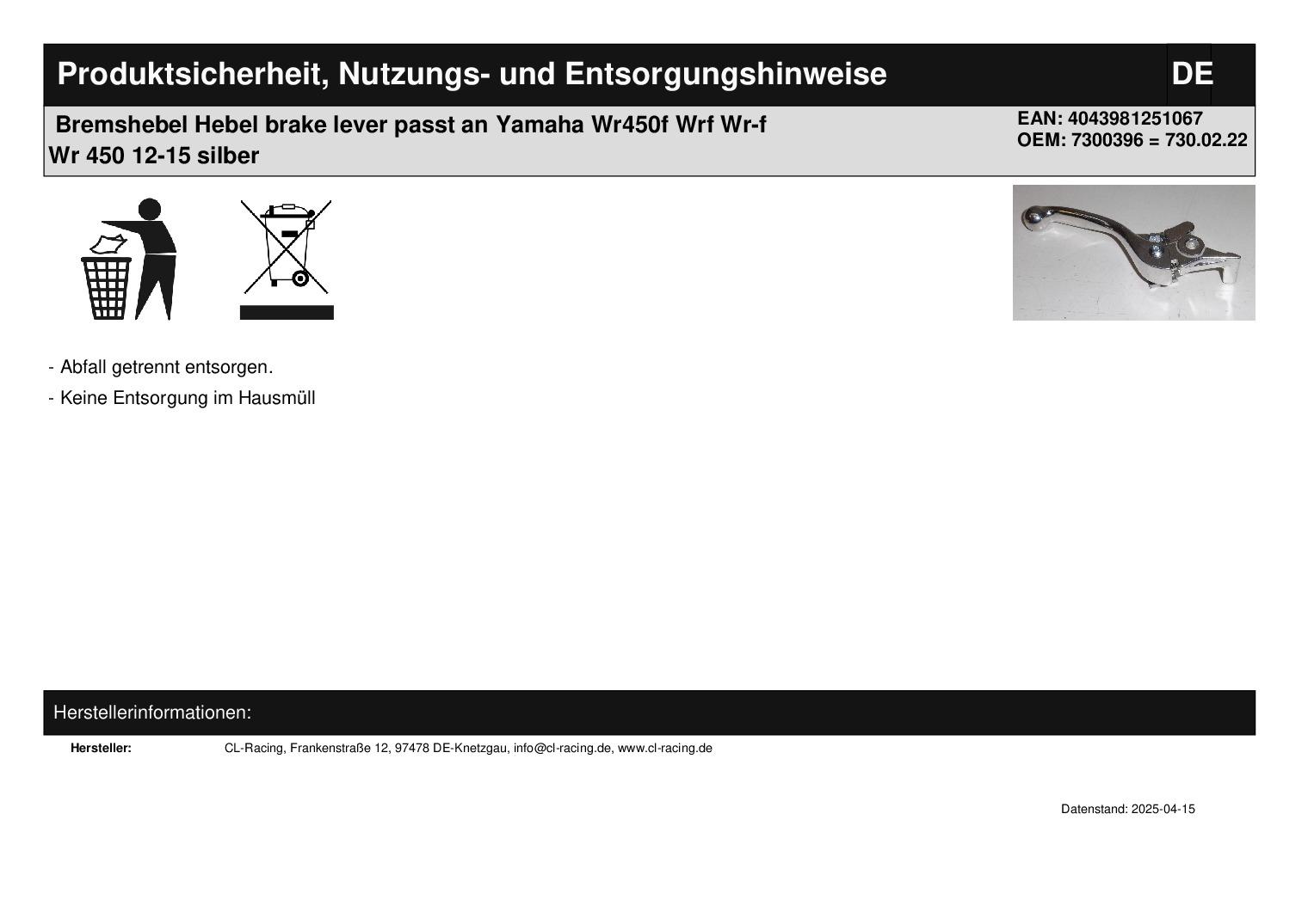 In dieser Auktion gibt es folgenden Artikel zu kaufen: Bremshebel (siehe Foto) Modell: passend für Yamaha Wr-f 450 Bj.: 2012 - 2015 (4-Takt) Lieferumfang: siehe Foto Artikelzustand: neu Bei Unklarheiten oder Fragen bitte erst E-Mail schreiben.