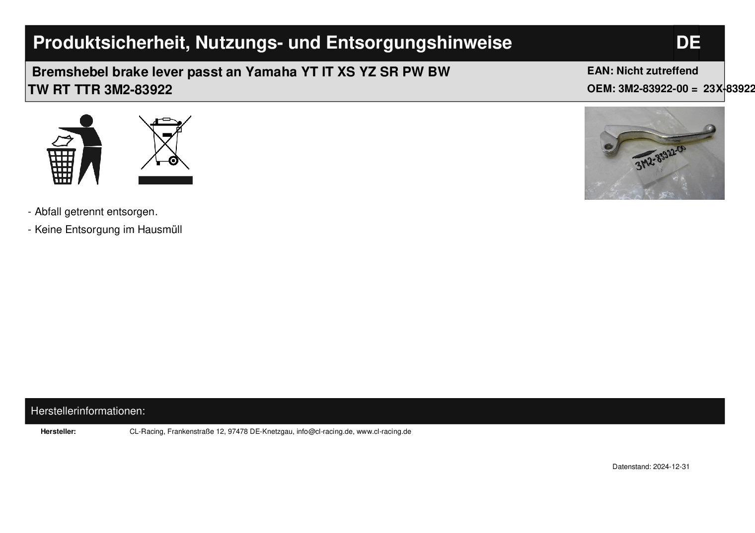In dieser Auktion gibt es folgenden Artikel zu kaufen: Bremshebel (siehe Foto) Modell: passend für Yamaha Bj.: 1983 YT175K Bj.: 1983 YTM200EK Bj.: 1983 YTM200K Bj.: 1983 YTM225DXK Bj.: 1984 TRI MOTO YTM200L Bj.: 1984 TRI MOTO 225DX YTM225DXL Bj.: 1984 YTM200EL Bj.: 1985 MOTO 4 YFM200N Bj.: 1985 TRI MOTO YTM200ERN Bj.: 1985 TRI MOTO YTM200N Bj.: 1985 TRI MOTO YTM225DR Bj.: 1985 TRI MOTO YTM225DXN Bj.: 1978 YZ125E HANDLEBAR CABLE YZ125E F Bj.: 1979 IT175F HANDLE WIRE Bj.: 1979 IT250F Bj.: 1979 IT400F HANDLE WIRE Bj.: 1979 XS400_2F Bj.: 1979 YZ100F YZ100F Bj.: 1979 YZ125F HANDLEBAR CABLE YZ125E F Bj.: 1979 YZ250F B j.: 1979 YZ400F HANDLE WIRE Bj.: 1979 YZ80F HANDLE WIRE YZ80F Bj.: 1980 IT125G Bj.: 1980 IT175G B j.: 1980 IT250G Bj.: 1980 IT425G Bj.: 1980 SR250G Bj.: 1980 XS400G Bj.: 1980 YZ100G Bj.: 1980 YZ125G YZ125G Bj.: 1980 YZ125G HANDLEBAR CABLE YZ125E F Bj.: 1980 YZ250G YZ250G Bj.: 1980 YZ465G Bj.: 1980 YZ50G Bj.: 1980 YZ80G YZ80G H Bj.: 1981 IT125H Bj.: 1981 IT175H Bj.: 1981 IT250H Bj.: 1981 MX100H MX100H J K Bj.: 1981 MX175H Bj.: 1981 SR250H Bj.: 1981 SR250H B j.: 1981 SR250TH Bj.: 1981 TT250H Bj.: 1981 TT500H Bj.: 1981 XS400 XS400H Bj.: 1981 YZ100H Bj.: 1981 YZ125H Bj.: 1981 YZ250H YZ250H Bj.: 1981 YZ465H Bj.: 1982 IT175J Bj.: 1982 IT250J Bj.: 1982 IT465J Bj.: 1982 SR250J Bj.: 1982 TT250J Bj.: 1982 XS400SJ Bj.: 1982 YZ100J Bj.: 1982 YZ125J Bj.: 1982 YZ250J Bj.: 1982 YZ490J Bj.: 1982 YZ60J YZ60J Bj.: 1982 YZ80J YZ80J Bj.: 1982 YZ80J YZ80J Bj.: 1983 IT175K Bj.: 1983 IT250K Bj.: 1983 IT490K Bj.: 1983 PW80K Bj.: 1983 TT600K Bj.: 1983 YZ100K Bj.: 1983 YZ125K Bj.: 1983 YZ125K Bj.: 1983 YZ250K Bj.: 1983 YZ490 YZ490K Bj.: 1983 YZ80 YZ80K Bj.: 1984 IT200L Bj.: 1984 IT490L Bj.: 1984 MOTOCROSS YZ125L Bj.: 1984 MOTOCROSS YZ125L Bj.: 1984 MOTOCROSS YZ490L Bj.: 1984 TT600L Bj.: 1984 YZ250L Bj.: 1984 YZ80L Bj.: 1985 BW200N Bj.: 1985 IT200N Bj.: 1985 TRIALS TY350N Bj.: 1985 Y ZINGER PW80N Bj.: 1985 YZ80N Bj.: 1986 BIG WHEEL BW200S Bj.: 1986 BIG WHEEL BW80S Bj.: 1986 BIG WHEEL ELEC START BW200ES Bj.: 1986 TRIALS TY350S Bj.: 1987 BIG WHEEL BW350T Bj.: 1987 BIG WHEEL BW80T Bj.: 1987 BIG WHEEL ELEC START BW200ET Bj.: 1987 TRAILWAY TW200T Bj.: 1987 TRAILWAY TW200TC Bj.: 1988 BIG WHEEL BW350U Bj.: 1988 BIG WHEEL BW80U Bj.: 1988 BIG WHEEL ELEC START BW200EU Bj.: 1988 TRAILWAY TW200U Bj.: 1988 TRAILWAY TW200UC Bj.: 1989 TRAILWAY TW200W Bj.: 1989 TRAILWAY TW200W Bj.: 1989 TRAILWAY TW200WC Bj.: 1989 TRAILWAY TW200WC Bj.: 1990 BIG WHEEL BW80A Bj.: 1990 OFF ROAD RT100A Bj.: 1990 TRAILWAY TW200A Bj.: 1990 TRAILWAY TW200AC Bj.: 1991 TRAILWAY TW200B Bj.: 1991 TRAILWAY TW200BC Bj.: 1991 Y ZINGER PW80B Bj.: 1992 RT100D Bj.: 1992 TRAILWAY TW200D Bj.: 1992 TRAILWAY TW200D Bj.: 1992 TRAILWAY TW200DC Bj.: 1992 TRAILWAY TW200DC Bj.: 1992 Y ZINGER PW80D Bj.: 1993 RT100E Bj.: 1993 TRAILWAY TW200E Bj.: 1993 TRAILWAY TW200EC Bj.: 1993 Y ZINGER PW80E Bj.: 1994 RT100F Bj.: 1994 Y ZINGER PW80F Bj.: 1995 RT100G Bj.: 1995 TRAILWAY TW200G Bj.: 1995 TRAILWAY TW200GC Bj.: 1995 Y ZINGER PW80G Bj.: 1996 RT100H Bj.: 1996 TW200H Bj.: 1996 TW200HC Bj.: 1997 OFF ROAD (INK BLUE) RT100J Bj.: 1996 Y ZINGER PW80H Bj.: 1997 TRAILWAY TW200J Bj.: 1997 TRAILWAY TW200JC Bj.: 1997 Y ZINGER PW80J Bj.: 1998 RT100K Bj.: 1998 TRAILWAY TW200K Bj.: 1998 TRAILWAY TW200KC Bj.: 1998 Y ZINGER PW80K1 Bj.: 1999 PW80 PW80L1 Bj.: 1999 RT100L (DEEP PURPLISH BLUE SOLID E) Bj.: 1999 TRAILWAY TW200L Bj.: 1999 TRAILWAY TW200LC Bj.: 2000 OFF ROAD (Deep Purplish Blue Solid E) (CA Ed.) TT125RMC Bj.: 2000 OFF ROAD (Deep Purplish Blue Solid E) TT125RM Bj.: 2000 OFF ROAD TT90RM Bj.: 2000 OFF ROAD TT90RMC Bj.: 2000 RT100 RT100M Bj.: 2000 TRAILWAY TW200M Bj.: 2000 TRAILWAY TW200MC Bj.: 2000 TTR125 TTR125M Bj.: 2000 TTR125 TTR125MC Bj.: 2000 TTR90 TTR90M Bj.: 2000 TTR90 TTR90MC Bj.: 2000 Y ZINGER PW80M1 Bj.: 2001 TTR125 TTR125N Bj.: 2001 TTR125L TTR125LN Bj.: 2001 TTR90 TTR90N Bj.: 2001 YZINGER PW80N1 Bj.: 2002 PW80 PW80P Bj.: 2002 TTR125 TTR125P Bj.: 2002 TTR125_L TTR125LP Bj.: 2002 TTR90 TTR90P Bj.: 2003 PW80 PW80R Bj.: 2003 TTR125 TTR125 R Bj.: 2003 TTR125E TTR125ER E Bj.: 2003 TTR125L TTR125LR R Bj.: 2003 TTR125LE TTR125LER ER Bj.: 2003 TTR90 TTR90ER Bj.: 2003 TTR90 TTR90R Bj.: 2004 TT R125 TTR125S S Bj.: 2004 TT R125E TTR125ES ES Bj.: 2004 TT R125E TTR125LES ES Bj.: 2004 TT R125L TTR125LS S Bj.: 2004 TT R90E TTR90ES Bj.: 2004 TTR90 TTR90S Bj.: 2005 TT R90E TTR90ET Bj.: 2006 TT R90E ELETRIC TTR90EV Bj.: 2007 TTR90E TTR90EW Bj.: 2008 TTR110E TTR110EX Bj.: 2009 TTR110E TTR110EY Bj.: 2011 TTR110E TTR110EA Bj.: 2012 TTR110E TTR110EB Bj.: 2013 TTR110E TTR110ED Bj.: 2014 TTR110E TTR110EE Teilenummer: 3M2-83922-00 = 23X-83922-00 Bitte Teilenummer vergleichen! Lieferumfang: 1 Stück Artikelzustand: neu aus Geschäftsauflösung, mit minimalen Lagerspuren; Zustand siehe Foto Bei Unklarheiten oder Fragen bitte erst E-Mail schreiben.