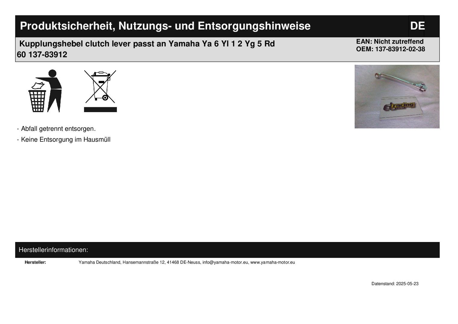 In dieser Auktion gibt es folgenden Artikel zu kaufen: Kupplungshebel (siehe Foto) Modell: für Yamaha YA 6 Bj.: 66 YL 1 Bj.: 66 - 67 YL 2 Bj.: 67 YG 5 Bj.: 68 - 69 YLCM Bj.: 68 L 5 Bj.: 69 - 70 G 6 Bj.: 70 - 71 G 7 Bj.: 72 JT 1 Bj.: 71 JT 2 Bj.: 72 GT 1 Bj.: 73 GTMX Bj.: 73 - 79 RD 60 Bj.: 73 - 75 GT 80 Bj.: 74 - 79 LB 50 Bj.: 78 - 81 LB 80 Bj.: 76 - 78 DT 80 Bj.: 81 - 82 DT 100 Bj.: 77 - 83 QT 50 Bj.: 79 - 87 LC 50 Bj.: 80 MX 80 Bj.: 80 - 82 MJ 50 Bj.: 82 Lieferumfang: 1 Stück Artikelzustand: neu aus Geschäftsauflösung, mit minimalen Lagerspuren; Zustand siehe Foto Bei Unklarheiten oder Fragen bitte erst E-Mail schreiben.