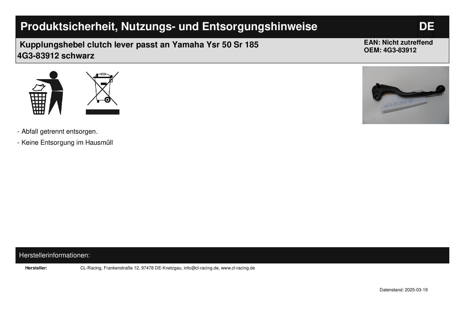 In dieser Auktion gibt es folgenden Artikel zu kaufen: Kupplungshebel (siehe Foto) Modell: passend für Yamaha YSR 50 Bj.: 87 - 92 SR 185 Bj.: 81 - 82 Lieferumfang: 1 Stück Artikelzustand: neu aus Geschäftsauflösung, mit minimalen Lagerspuren; Zustand siehe Foto Bei Unklarheiten oder Fragen bitte erst E-Mail schreiben.