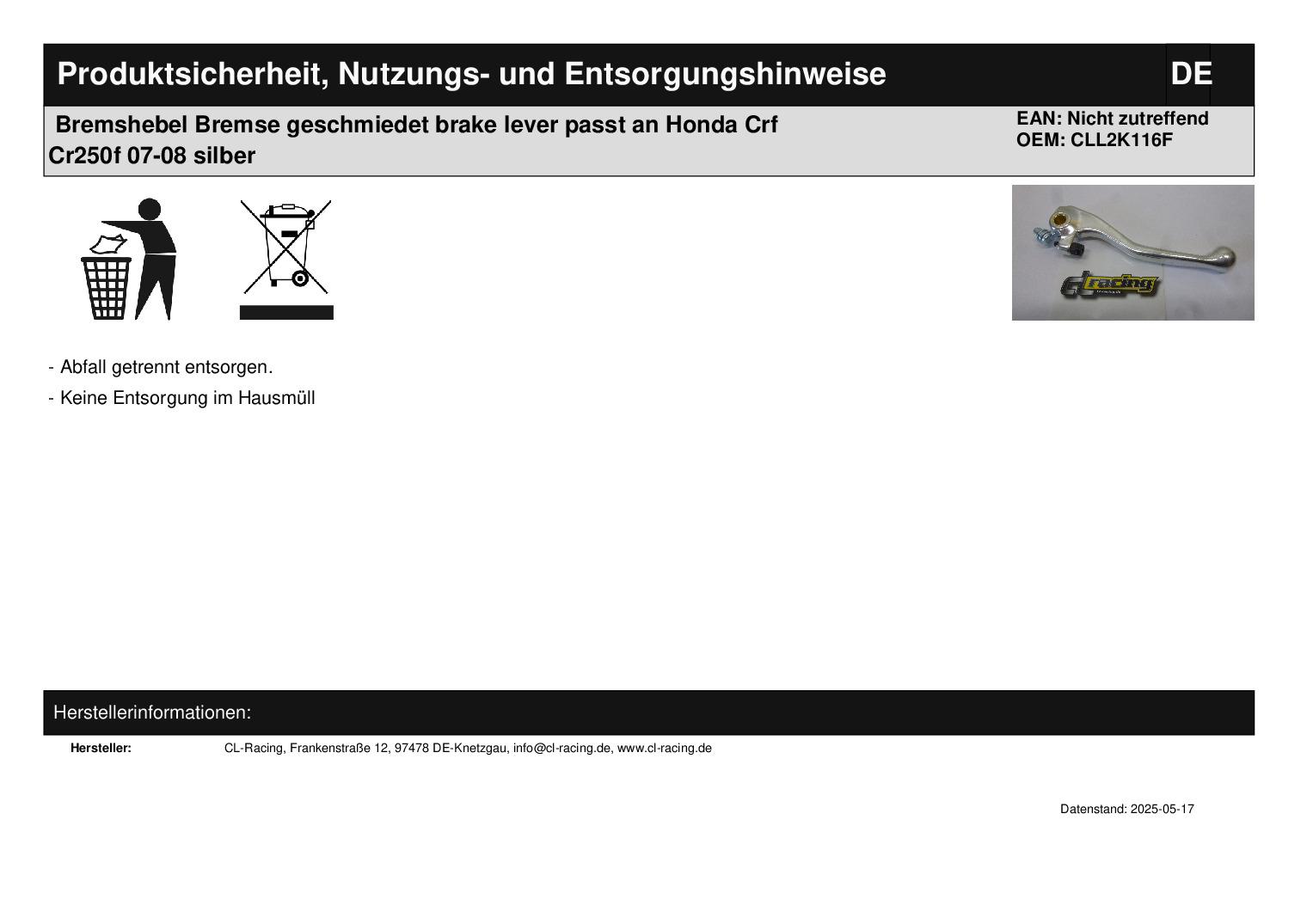 In dieser Auktion gibt es folgenden Artikel zu kaufen: geschmiedeter Bremshebel (siehe Foto) Modell: passend für Honda CRF 250 R Bj.: 07 - 08 (4-Takt) Artikelbeschreibung: Durch das Schmieden wird die Materialdichte erhöht und macht den Hebel elastischer und damit bruchsicherer als Hebel, die durch das Spritzgussverfahren produziert werden. Lieferumfang: siehe Foto Artikelzustand: neu Bei Unklarheiten oder Fragen bitte erst E-Mail schreiben.
