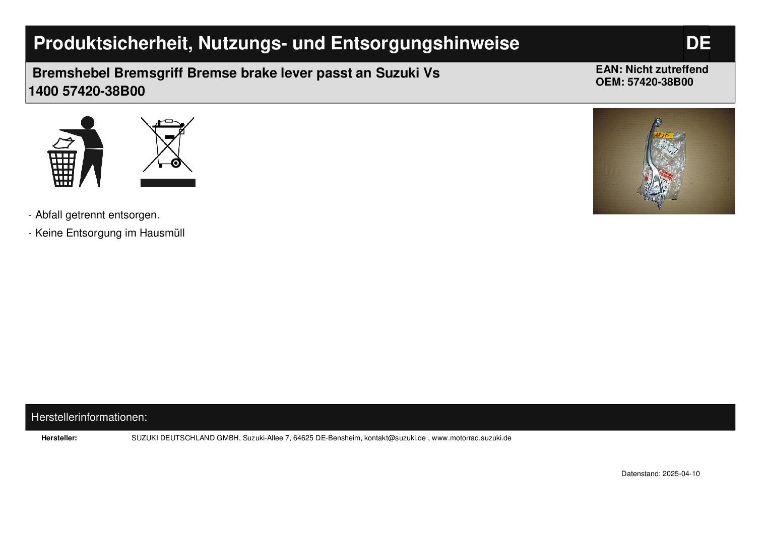 In dieser Auktion gibt es folgenden Artikel zu kaufen: Bremshebel (siehe Foto) Modell: passend für Suzuki VS 1400 Bj.: 87 - 95 Lieferumfang: siehe Foto Artikelzustand: neu aus Geschäftsauflösung, mit leichten Lagerspuren; Zustand siehe Foto Bei Unklarheiten oder Fragen bitte erst E-Mail schreiben.