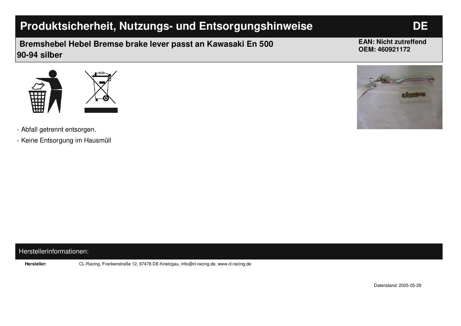 In dieser Auktion gibt es folgenden Artikel zu kaufen: Bremshebel (siehe Foto) Modell: passend für Kawasaki EN 500 Bj.: 90 - 94 Lieferumfang: siehe Foto Artikelzustand: neu aus Geschäftsauflösung, mit minimalen Lagerspuren; Zustand siehe Foto Bei Unklarheiten oder Fragen bitte erst E-Mail schreiben.