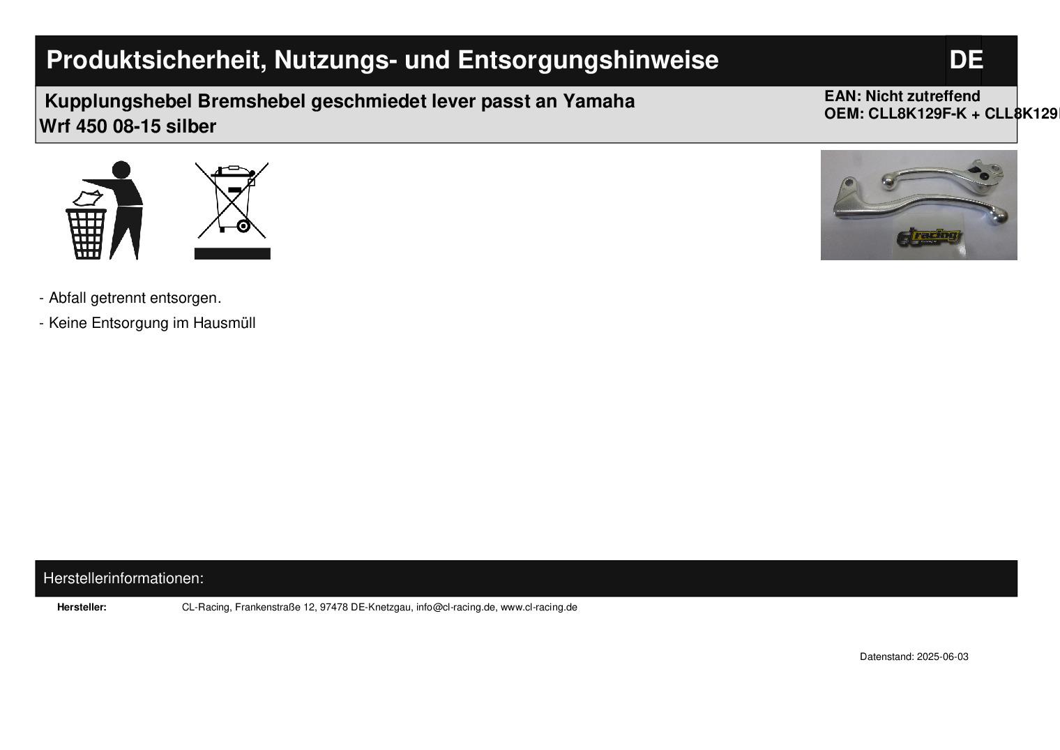 Titel: Bremshebel Kupplungshebel geschmiedet lever passt an Yamaha Wrf 450 08-15 silber