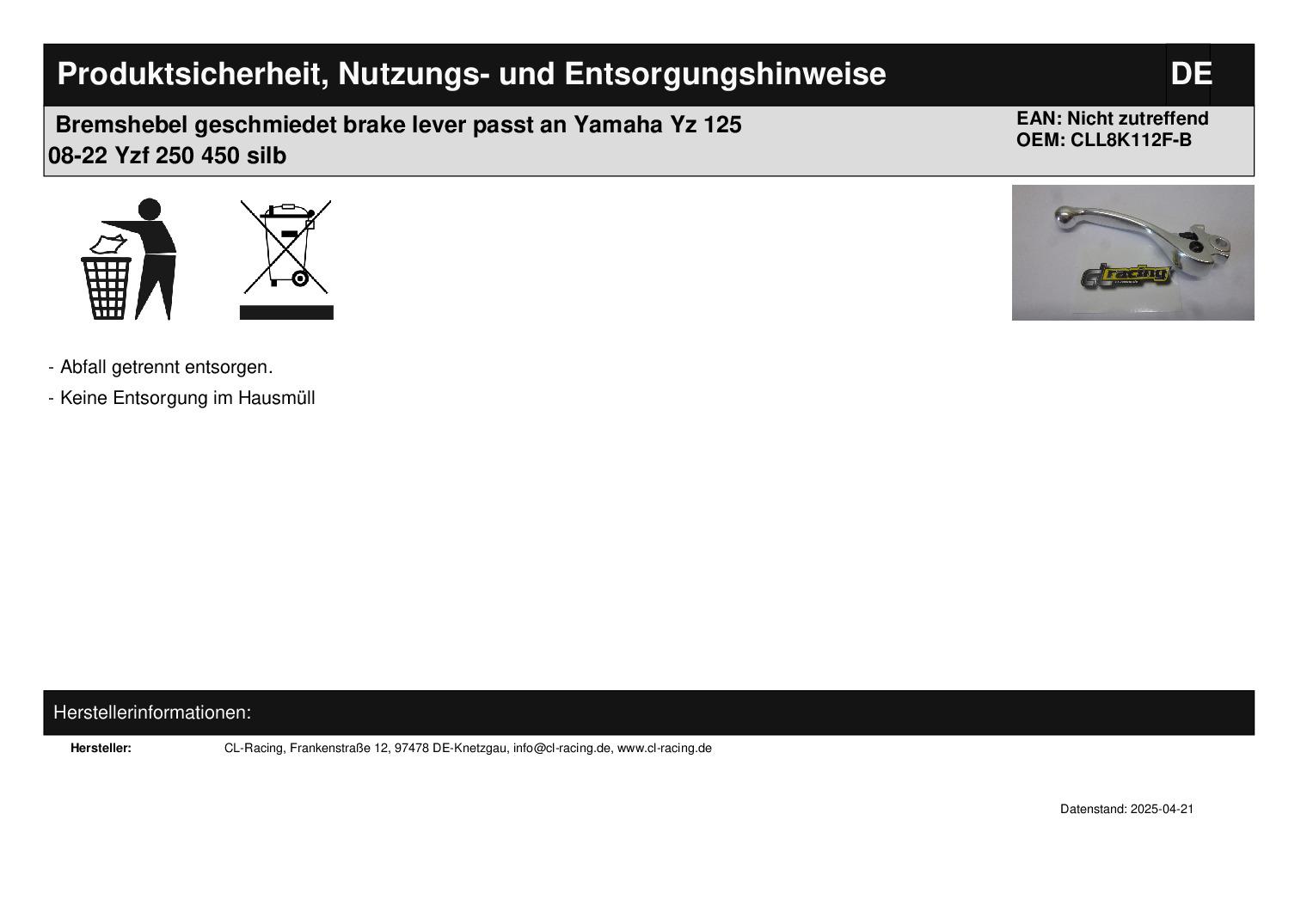 In dieser Auktion gibt es folgenden Artikel zu kaufen: geschmiedeter Bremshebel (siehe Foto) Modell: passend für Yamaha Yz 125 250 Bj.: 2008 - 2022 (2-Takt) Yz-f 250 Bj.: 2007 - 2022 (4-Takt) Yz-f 450 Bj.: 2008 - 2018 (4-Takt) Wr-f 250 Bj.: 2018 - 2022 (4-Takt) Wr-f 450 Bj.: 2017 - 2022 (4-Takt) passend für Kawasaki Kx-f 250 Bj.: 2013 - 2014 (4-Takt) Kx-f 450 Bj.: 2013 - 2015 (4-Takt) Artikelbeschreibung: Durch das Schmieden wird die Materialdichte erhöht und macht den Hebel elastischer und damit bruchsicherer als Hebel, die durch das Spritzgussverfahren produziert werden. Lieferumfang: siehe Foto Artikelzustand: neu Bei Unklarheiten oder Fragen bitte erst E-Mail schreiben.