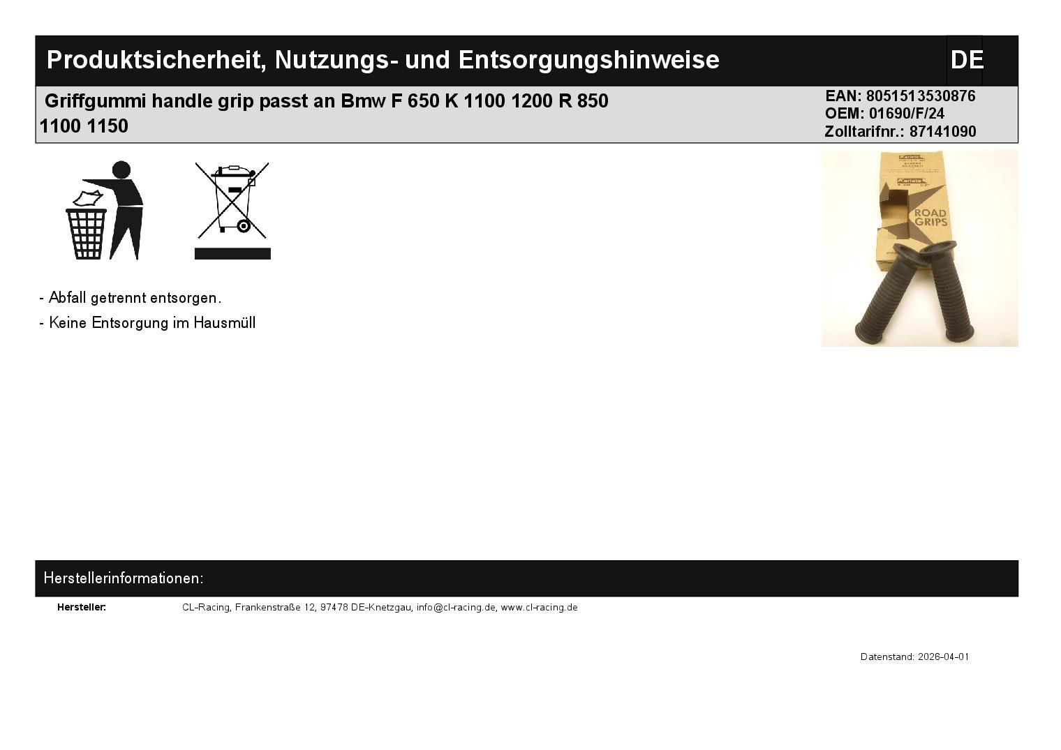 In dieser Auktion gibt es folgenden Artikel zu kaufen: Griffgummis (siehe Foto) Hersteller: Ariete Modell: passend für BMW F 650 GS Bj.: 1993 - 2008 K 1100 Bj.: 1990 - 1998 K 1200 Bj.: 1997 - 2009 R 850 Bj.: 1995 - 2006 R 1100 Bj.: 1992 - 2005 R 1150 Bj.: 1999 - 2006 Abmaße: links Ø = ca.25 mm rechts Ø = ca. 25 mm Länge = ca. 125 mm Artikelzustand: neu Lieferumfang: links + rechts