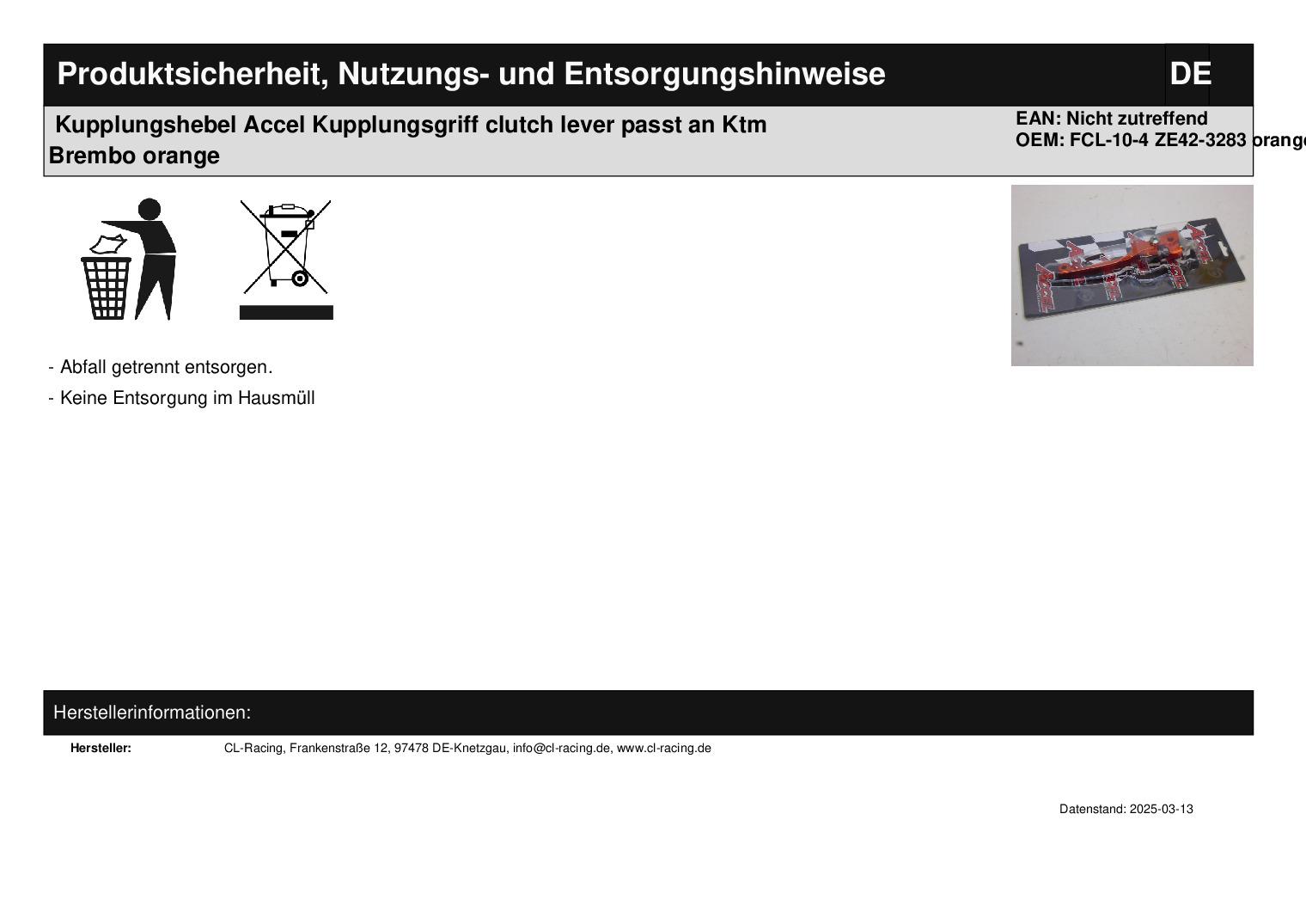 In dieser Auktion gibt es folgenden Artikel zu kaufen: Kupplungshebel (siehe Foto) Hersteller: Accel Modell: passend für Ktm Brembo Bj.: unbekannt Lieferumfang: 1 Stück Artikelzustand: neu aus Geschäftsauflösung, mit leichten Lagerspuren; Zustand siehe Foto Es handelt sich hierbei um kein Originalteil Bei Unklarheiten oder Fragen bitte erst E-Mail schreiben.