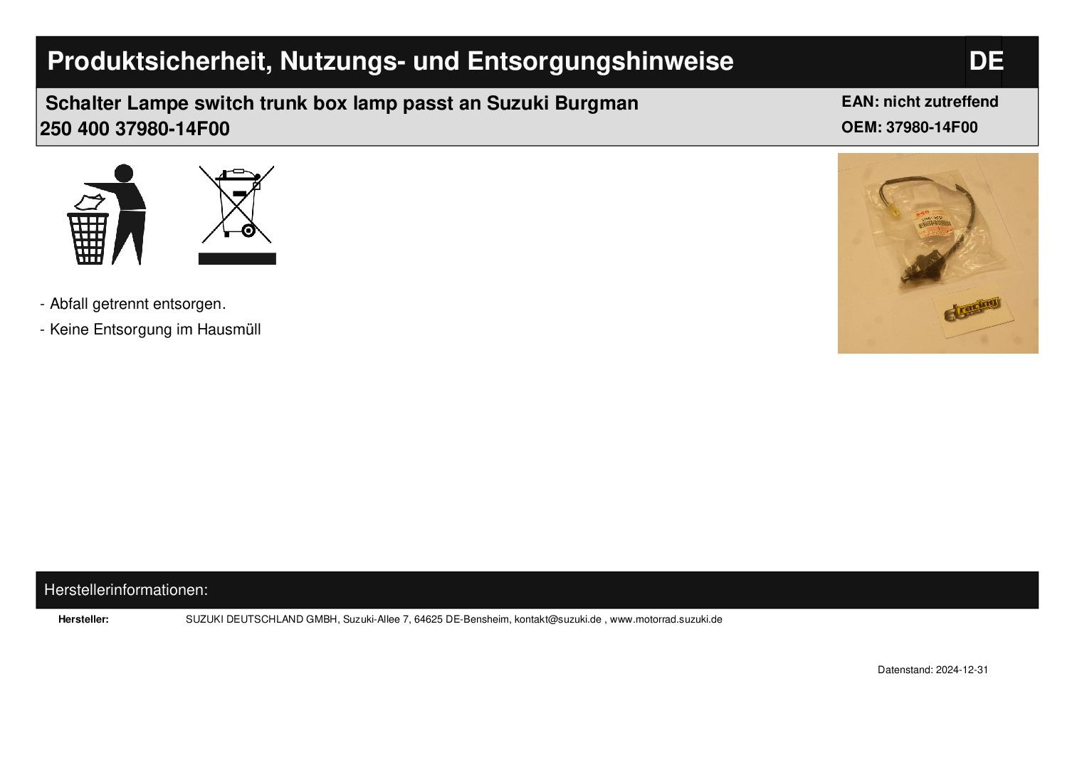 In dieser Auktion gibt es folgenden Artikel zu kaufen: Schalter (siehe Foto) Modell: passend für Suzuki Burgman 250 Bj.: 98 - 06 Burgmann 400 Bj.: 02 - 11 Lieferumfang: siehe Foto Artikelzustand: neu Bei Unklarheiten oder Fragen bitte erst E-Mail schreiben.