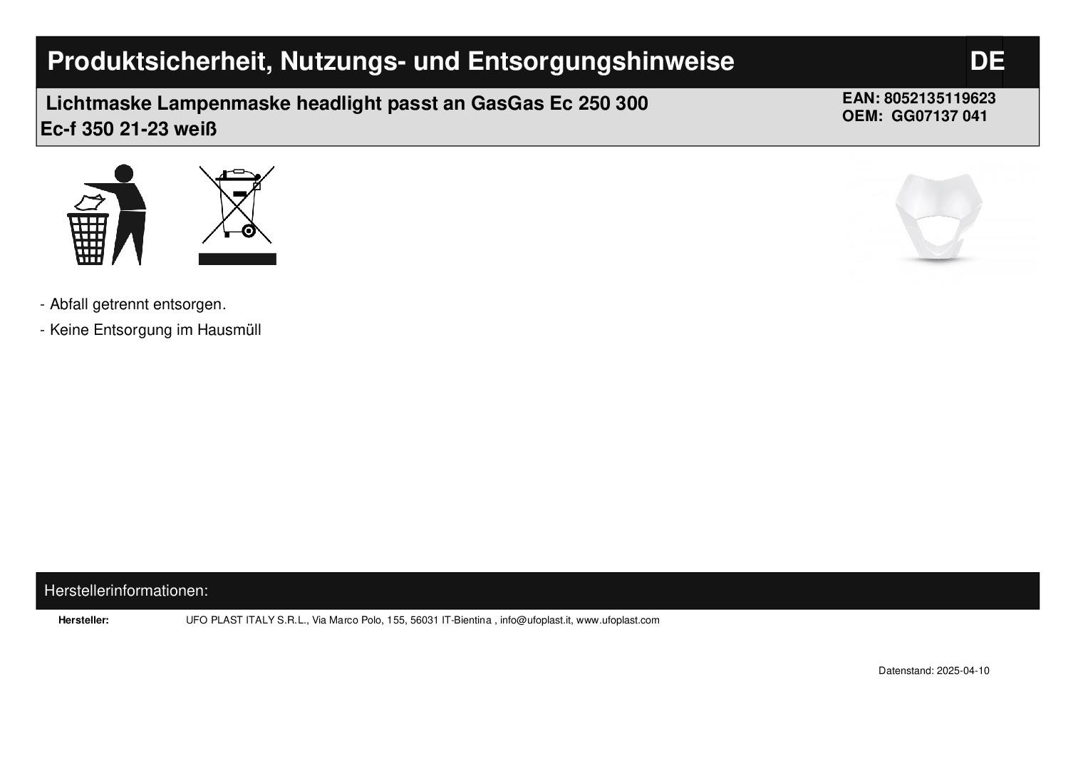 Titel: Lichtmaske Lampenmaske headlight passt an GasGas Ec 250 300 Ec-f 350 21-23 weiß