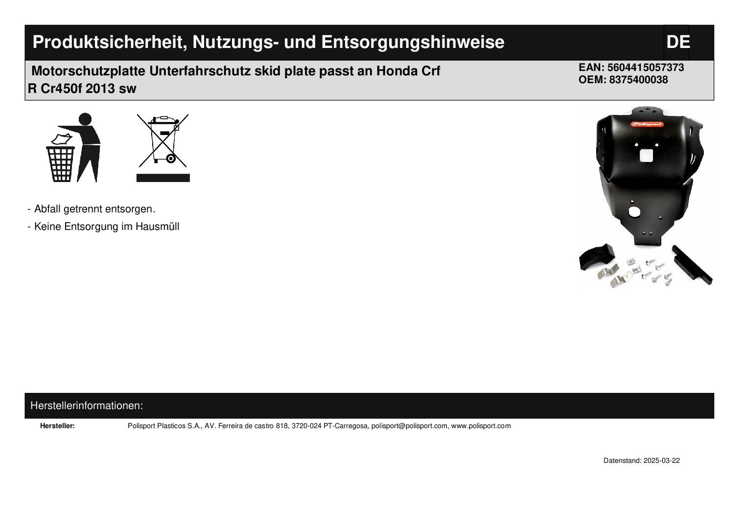 In dieser Auktion gibt es folgenden Artikel zu kaufen: Motorschutzplatte (siehe Foto) Modell: passend für Honda CRF 450 R Bj.: 2013 (4-Takt) Lieferumfang: Motorschutz mit Anbauteilen und Anbauanleitung Artikelzustand: neu Bei Unklarheiten oder Fragen bitte erst E-Mail schreiben.