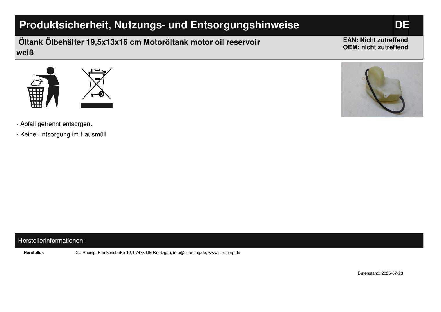 In dieser Auktion gibt es folgenden Artikel zu kaufen: Öltank (siehe Foto) Fahrzeug: unbekannt Bj.: unbekannt Maße: Länge Behälter gesamt: ca. 19,5 cm Breite Behälter gesamt: ca. 13 cm Höhe Behälter gesamt: ca. 16 cm Lieferumfang: siehe Foto Artikelzustand: normale Gebrauchsspuren vorhanden; Zustand siehe Foto Bei Unklarheiten oder Fragen bitte erst E-Mail schreiben.