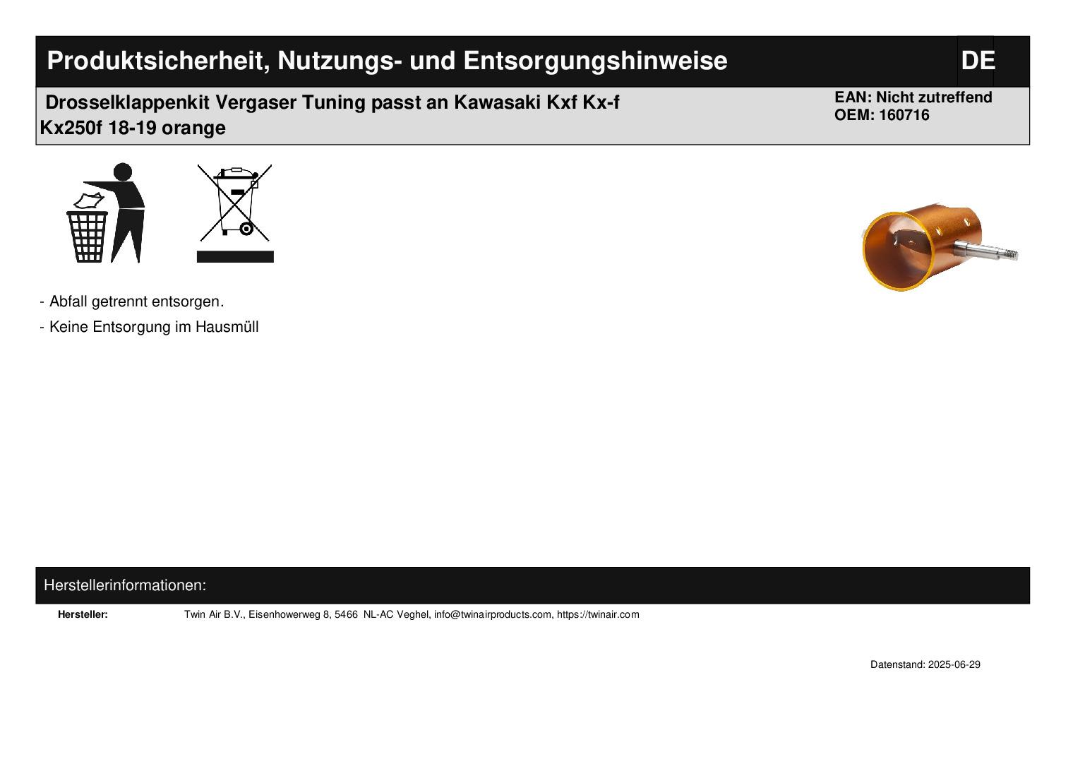 In dieser Auktion gibt es folgenden Artikel zu kaufen: Drosselklappenkit (ähnlich Foto) Modell: passend für Kawasaki Kx-f 250 Bj.: 2018 - 2019 (4-Takt) Details: Twin-Air-Powerflow-Drosselklappengehäuse-Kit Es verbessert -je nach Konfiguration- die Motordrehzahl. - Konfiguration 1: erhöht Leistung und Beschleunigung bei niedrigen und mittleren Drehzahlen - Konfiguration 2: erhöht die Leistung bei hohen Drehzahlen (ohne das orange Einlaufrohr) Lieferumfang: - 1 x oranges Einlassrohr - 1 x Stift - 2 x Drosselklappen (kleiner und großer Durchmesser) - 2 x Schrauben Artikelzustand: neu Bei Unklarheiten oder Fragen bitte erst E-Mail schreiben.