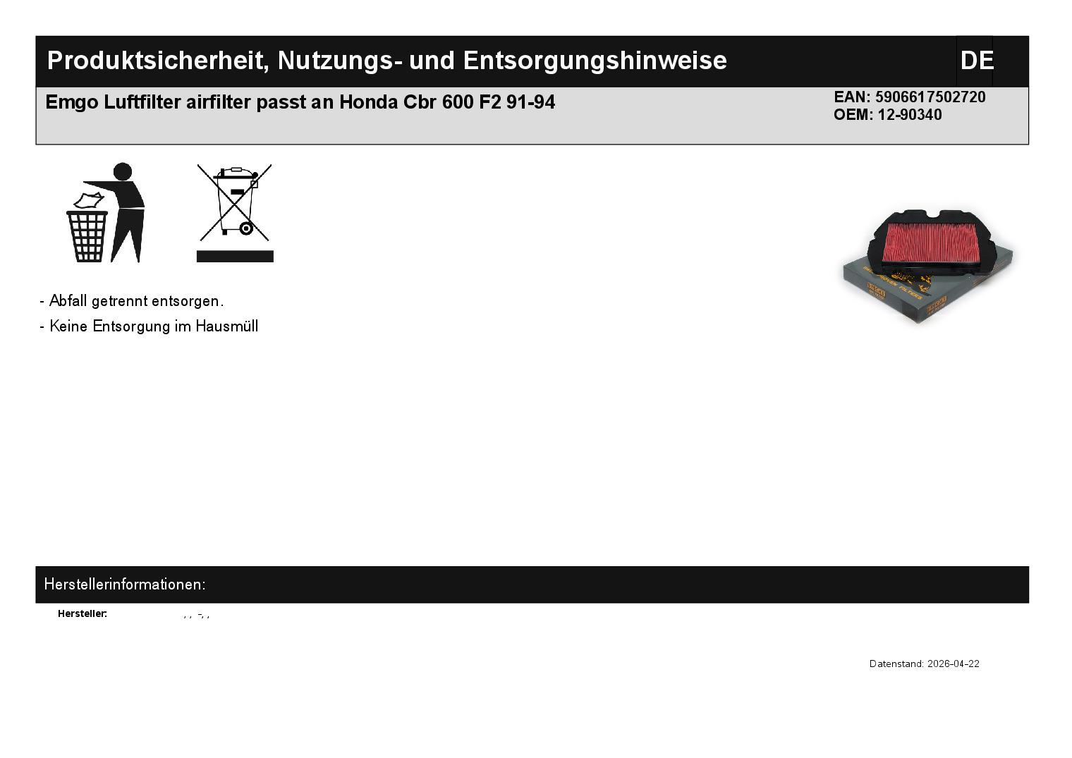 In dieser Auktion gibt es folgenden Artikel zu kaufen: Luftfilter (ähnlich Foto) Modell: passend für Honda CBR 600 F2 PC 25 Bj.: 1991 - 1994 Lieferumfang: 1 Stück Artikelzustand: neu Bei Unklarheiten oder Fragen bitte erst E-Mail schreiben.