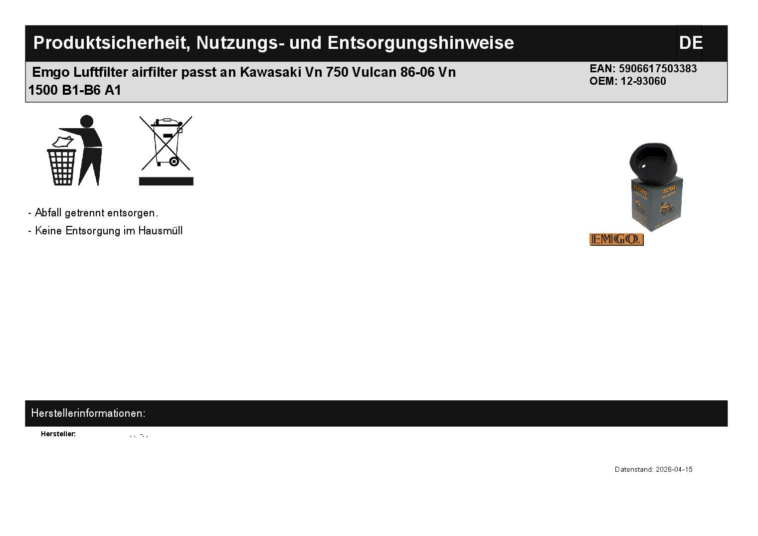 In dieser Auktion gibt es folgenden Artikel zu kaufen: Luftfilter (ähnlich Foto) Modell: passend für Kawasaki VN 750 Vulcan Bj.: 86 - 06 VN 1500 B1-B6 Vulcan Bj.: 87 - 93 VN 1500 A1-A9 Vulcan Bj.: 87 - 95 Lieferumfang: 1 Stück Artikelzustand: neu Hierbei handelt es sich um kein Originalteil! Bei Unklarheiten oder Fragen bitte erst E-Mail schreiben.