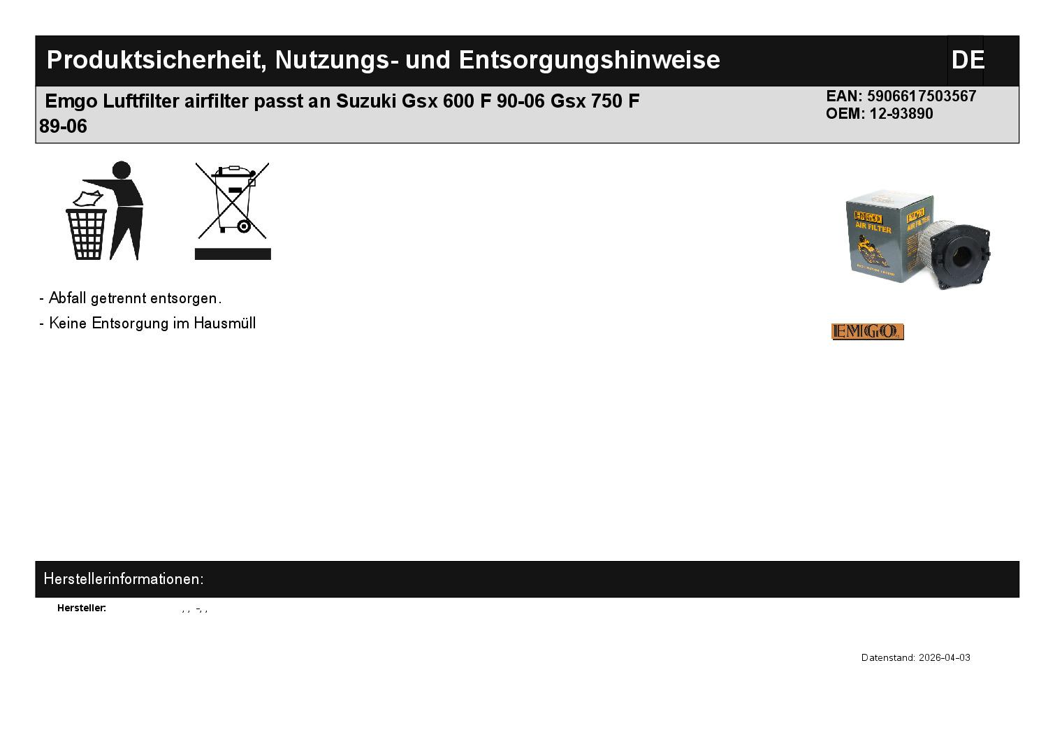 Titel: Emgo Luftfilter airfilter passt an Suzuki Gsx 600 F 90-06 Gsx 750 F 89-06