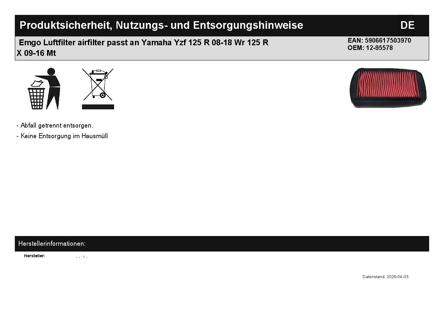 In dieser Auktion gibt es folgenden Artikel zu kaufen: Luftfilter (ähnlich Foto) Modell: passend für Yamaha YZF 125 R Bj.: 2008 .- 2018 WR 125 R Bj.: 2009 - 2016 WR 125 X Bj.: 2009 - 2016 MT 125 Bj.: 2015 - 2019 Lieferumfang: 1 Stück Artikelzustand: neu Hierbei handelt es sich um kein Originalteil! Bei Unklarheiten oder Fragen bitte erst E-Mail schreiben.