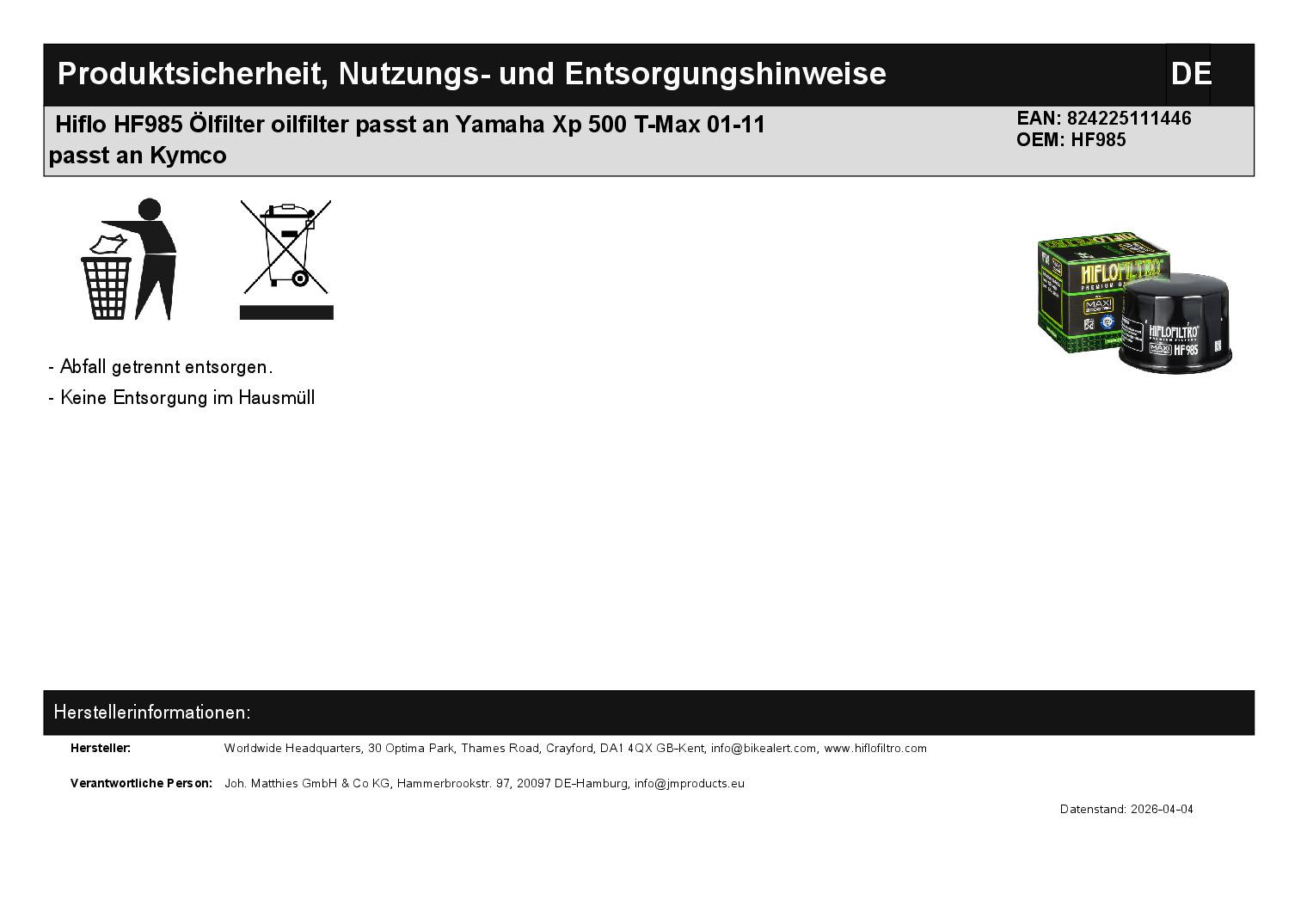 Titel: Hiflo HF985 Ölfilter oilfilter passt an Yamaha Xp 500 T-Max 01-11 passt an Kymco