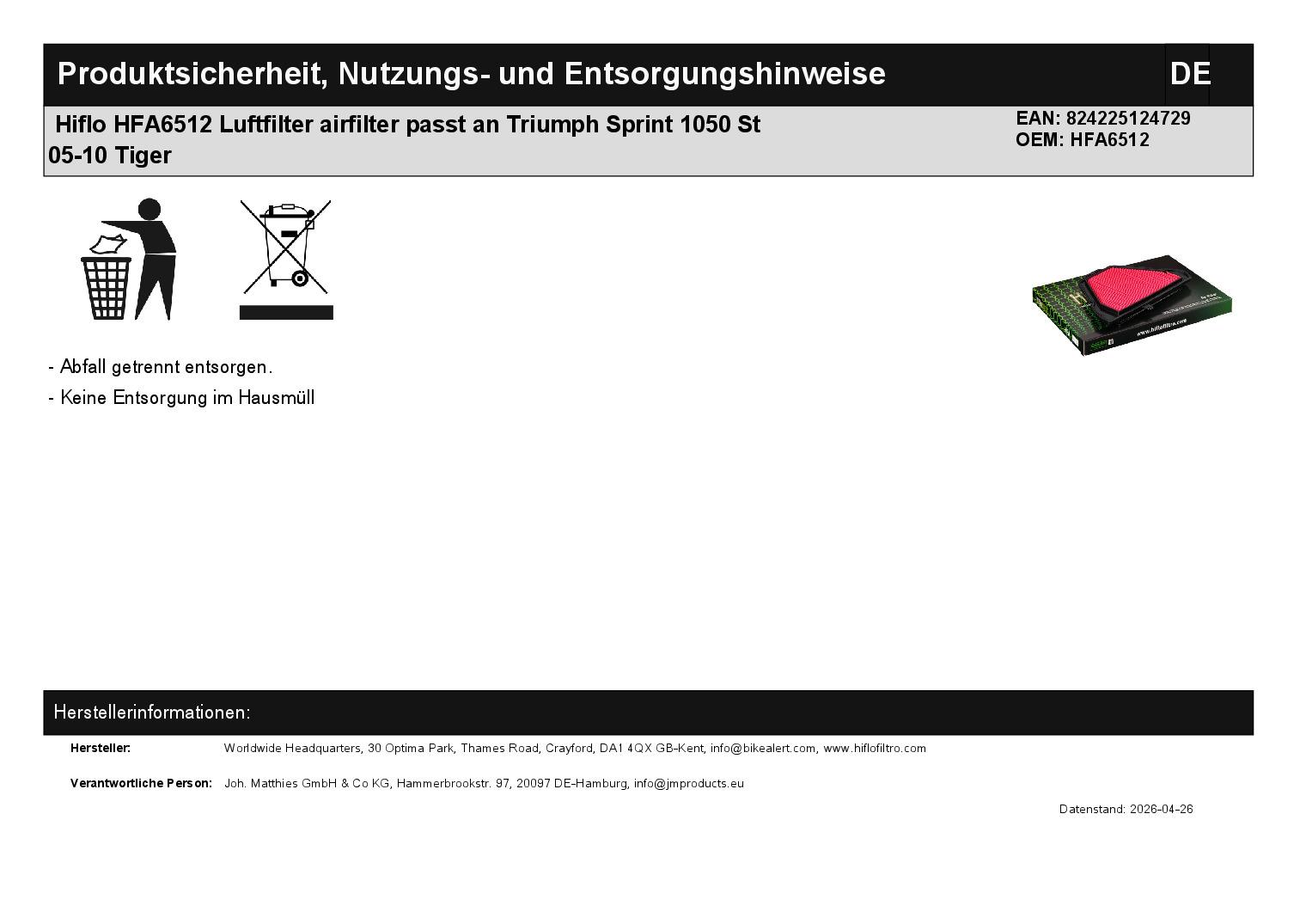 • Hiflo HFA6512 Luftfilter airfilter passt an Triumph Sprint 1050 St 05-10 Tiger