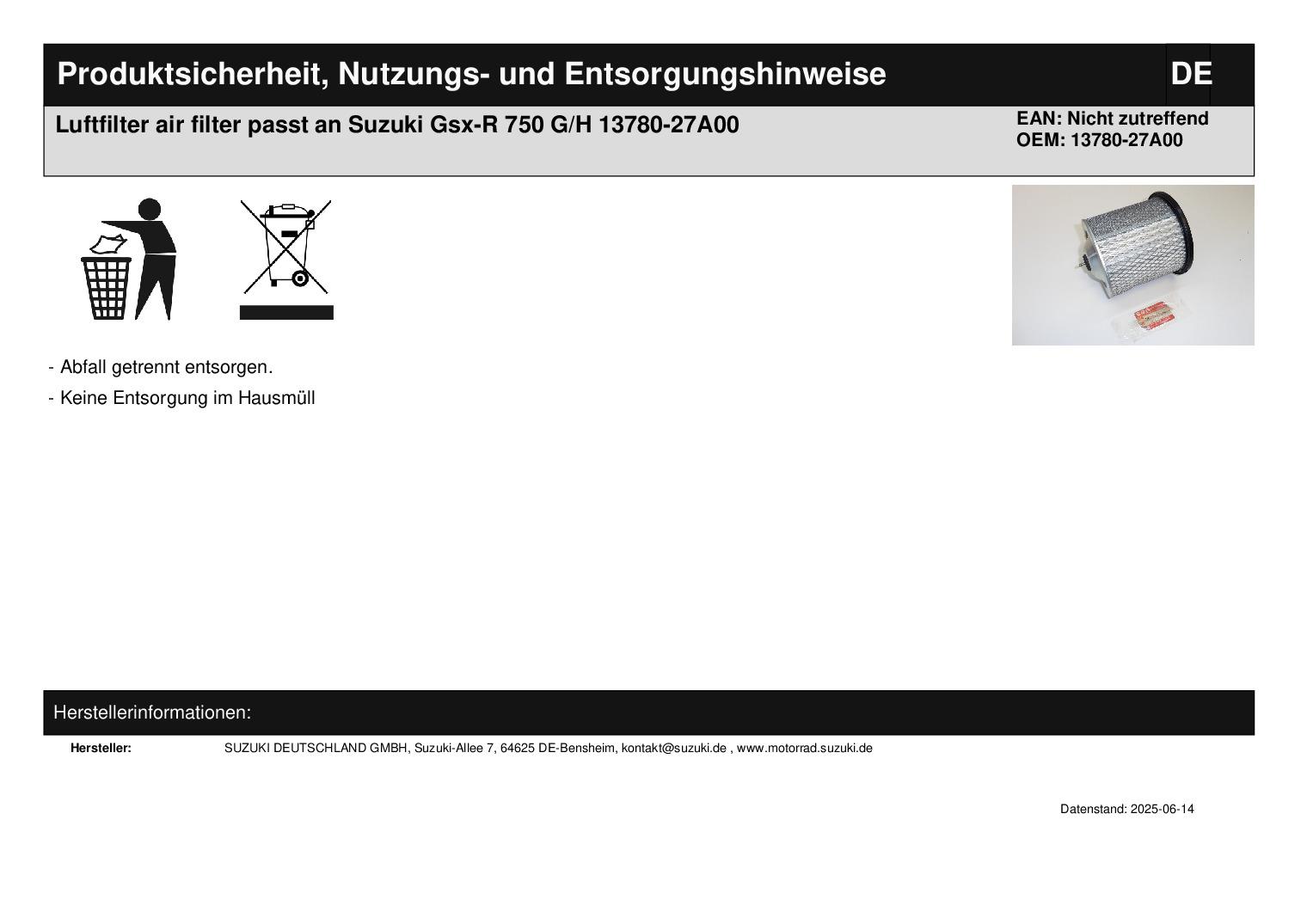 In dieser Auktion gibt es folgenden Artikel zu kaufen: Luftfilter (siehe Foto) Modell: passend für Suzuki GSX-R750 G/H Knicker Bj.: 1985 - 1987 Lieferumfang: 1 Stück Artikelzustand: neu aus Geschäftsauflösung, mit minimalen Lagerspuren; Zustand siehe Foto Hierbei handelt es sich um kein Originalteil! Bei Unklarheiten oder Fragen bitte erst E-Mail schreiben.