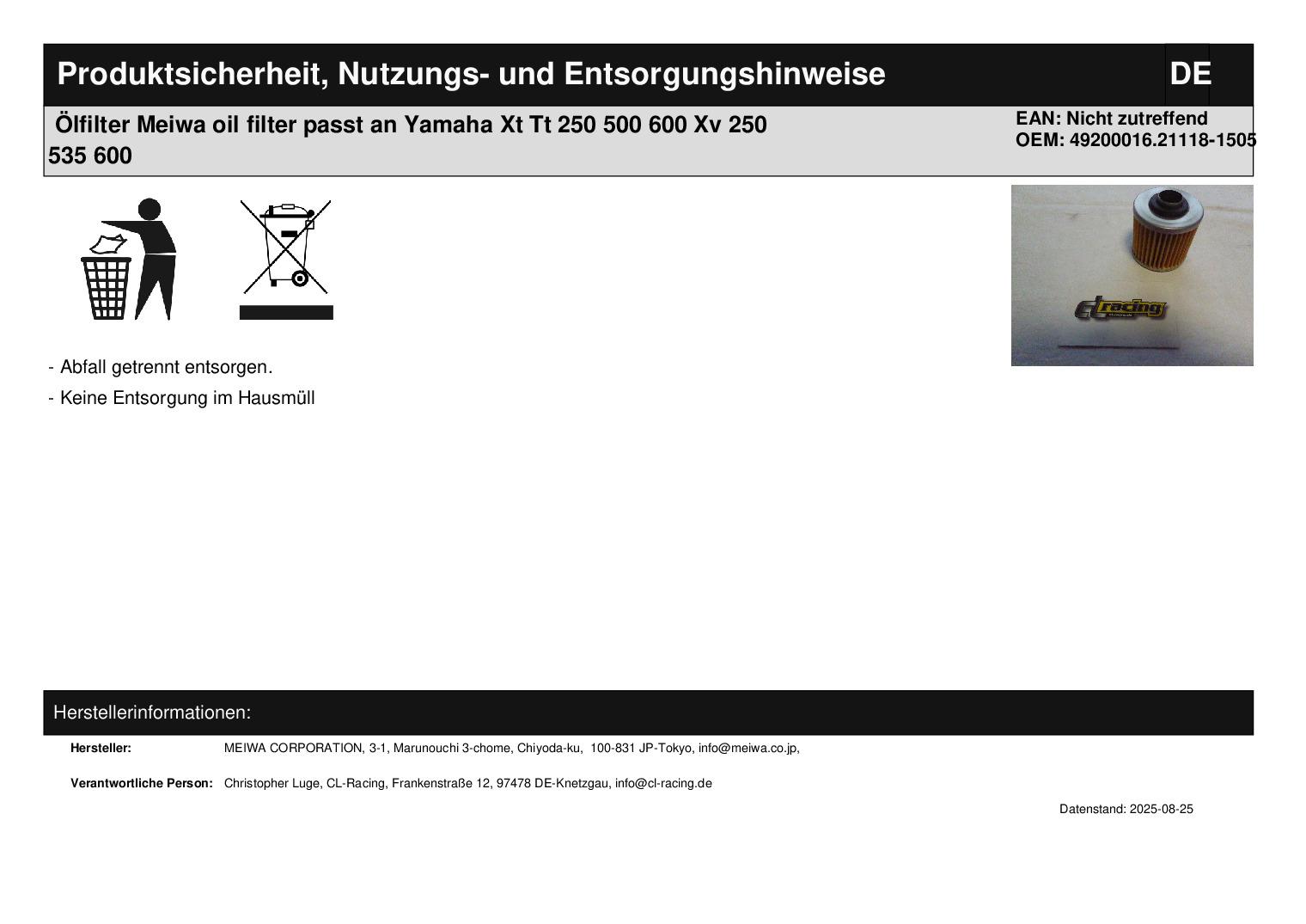 In dieser Auktion gibt es folgenden Artikel zu kaufen: Ölfilter (siehe Foto) Modell : passend für Yamaha XT 250, 500, 600 Bj.: unbekannt TT 250, 500, 600 Bj.: unbekannt XV 250, 535, 600 Bj.: unbekannt Lieferumfang: siehe Foto Artikelzustand: neu aus Geschäftsauflösung, mit minimalen Lagerspuren; Zustand siehe Foto Bei Unklarheiten oder Fragen bitte erst E-Mail schreiben.