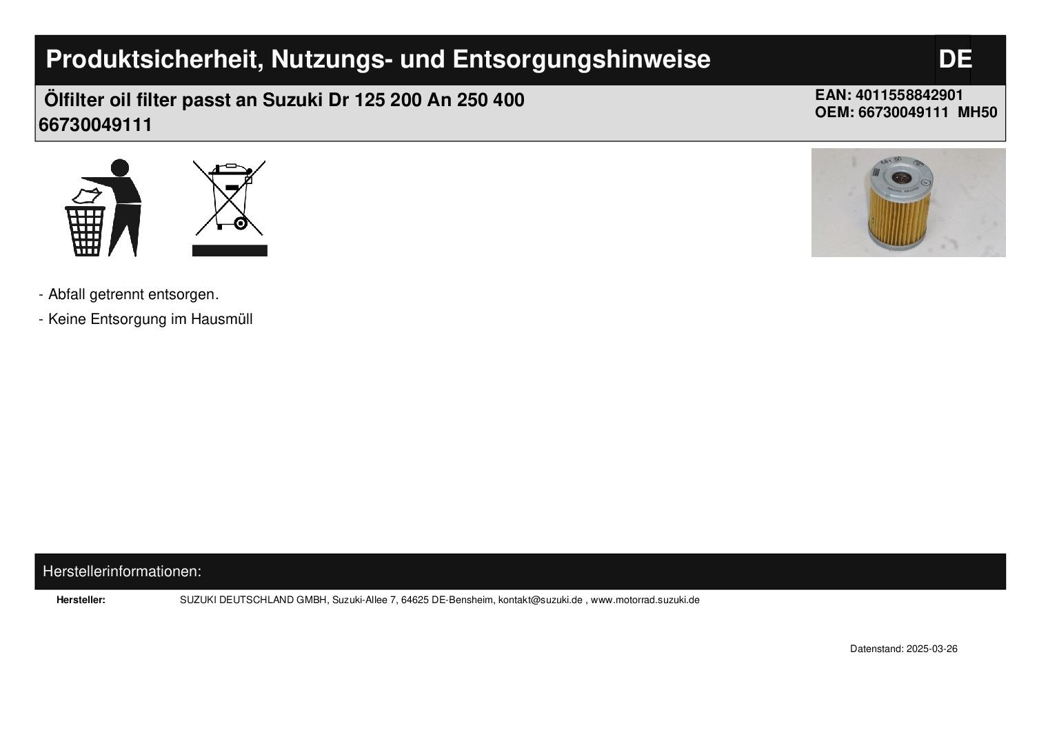 In dieser Auktion gibt es folgenden Artikel zu kaufen: Ölfilter (siehe Foto) Modell: passend für Suzuki DR 125 Bj.: 85 - 94 DR 200 Bj.: 86 - 88 AN 250 Bj.: 98 - 05 AN 400 Bj.: 99 - 22 Lieferumfang: siehe Foto Artikelzustand: neu aus Geschäftsauflösung, mit minimalen Lagerspuren; Zustand siehe Foto Bei Unklarheiten oder Fragen bitte erst E-Mail schreiben.