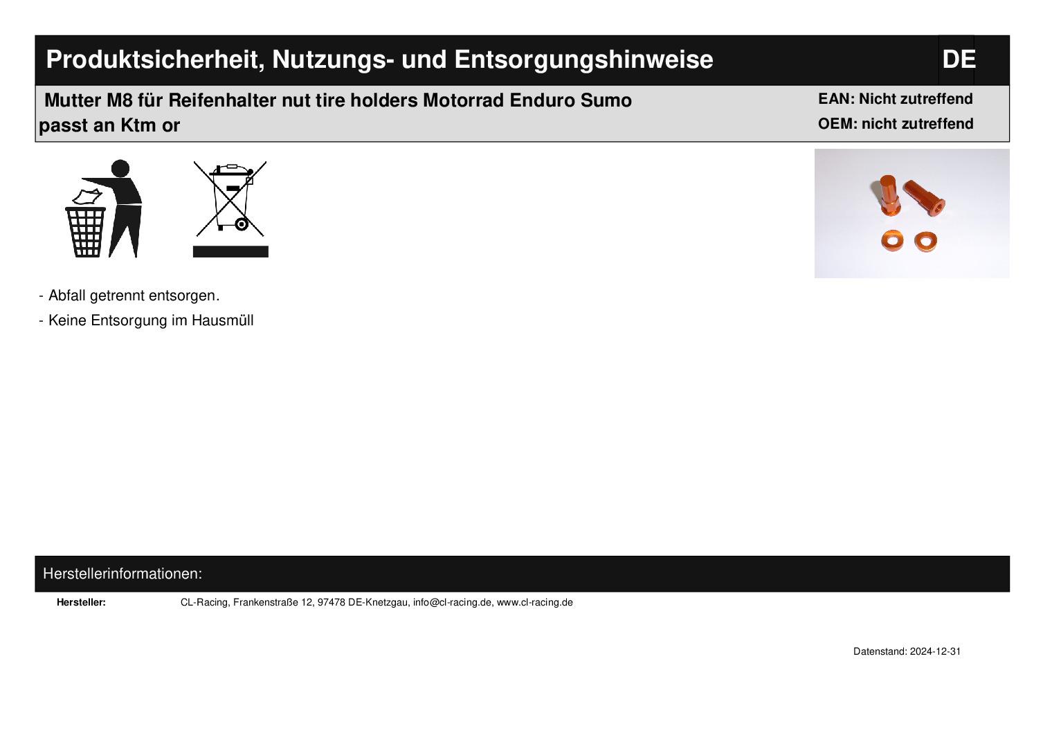 In dieser Auktion gibt es folgenden Artikel zu kaufen: Mutter mit Distanzring für Reifenhalter (siehe Foto) passend für: Enduros und Crosser mit Reifenhalter, der ein Gewinde M8 hat Gewinde: M8 Lieferumfang: 1 Paar Artikelzustand: neu Es handelt sich hierbei um kein Originalteil Bei Unklarheiten oder Fragen bitte erst E-Mail schreiben.