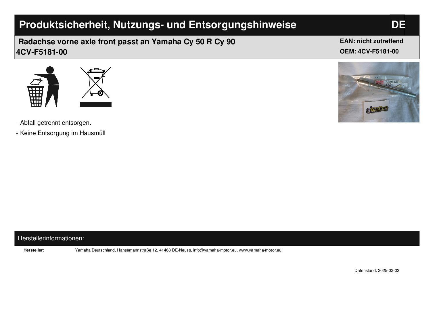 In dieser Auktion gibt es folgenden Artikel zu kaufen: Radachse vorne (siehe Foto) Modell: passend für Yamaha CY 50 R Bj.: 1996 CY 90 Bj.: 1991 Lieferumfang: 1 Stück Artikelzustand: neu aus Geschäftsauflösung, mit leichten Lagerspuren; Zustand siehe Foto