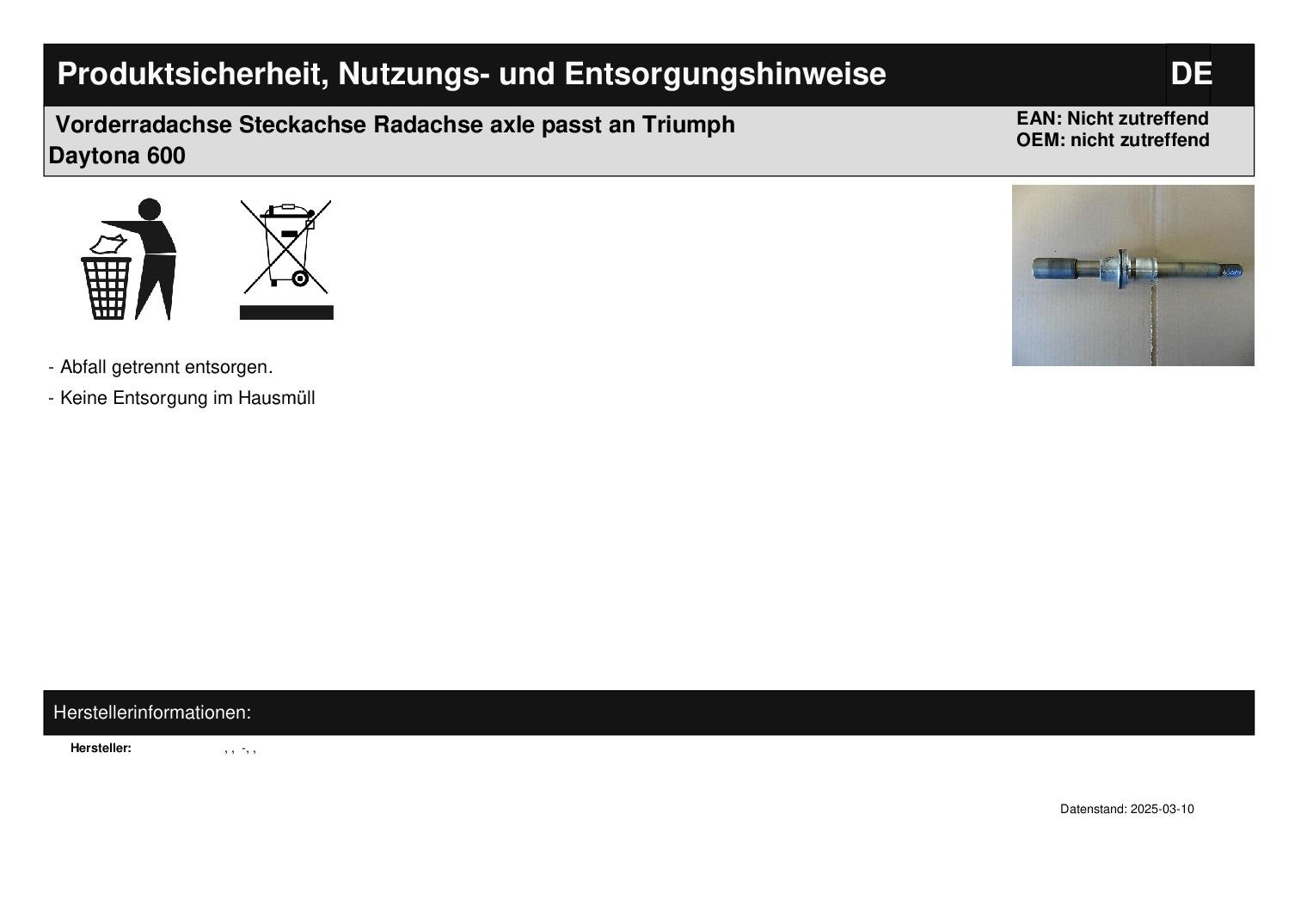 In dieser Auktion gibt es folgenden Artikel zu kaufen: Vorderradachse (siehe Foto) Fahrzeug: passend für Triumph Daytona 600 Erstzulassung: 03.2005 (passt evtl. auch für andere Modelle, bitte erst nachfragen!) Lieferumfang: siehe Foto Artikelzustand: normale Gebrauchsspuren vorhanden; Zustand siehe Foto Bei Unklarheiten oder Fragen bitte erst E-Mail schreiben.