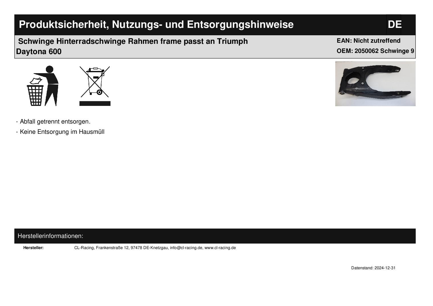 In dieser Auktion gibt es folgenden Artikel zu kaufen: originale Schwinge (siehe Foto) Fahrzeug: passend für Triumph Daytona 600 Erstzulassung: 03.2005 (passt evtl. auch für andere Modelle, bitte erst nachfragen!) Lieferumfang: siehe Foto Artikelzustand: normale, altersentsprechende Gebrauchsspuren wie leichte Lackschäden vorhanden; Zustand siehe Foto Bei Unklarheiten oder Fragen bitte erst E-Mail schreiben.