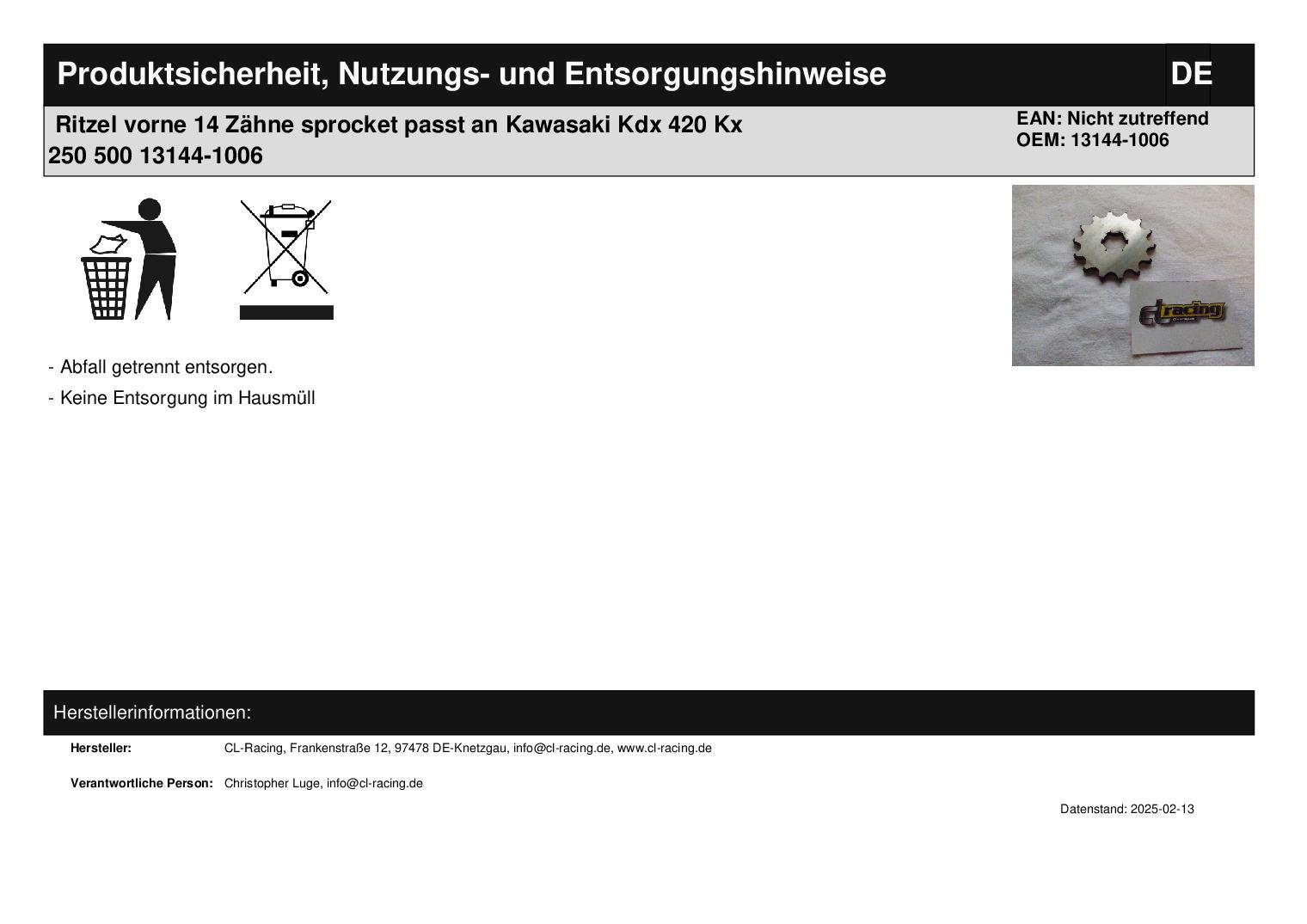In dieser Auktion gibt es folgenden Artikel zu kaufen: Ritzel (siehe Foto) Modell: passend für Kawasaki KDX 420 Bj.: 81 KX 250 Bj.: 82 - 87 KX 500 Bj.: 83 - 85 Details: Zähnezahl: 14 Vor dem Kauf bitte Übersetzung mit Ihrem Fahrzeug vergleichen! Lieferumfang: siehe Foto Artikelzustand: neu aus Geschäftsauflösung, mit minimalen Lagerspuren; Zustand siehe Foto Bei Unklarheiten oder Fragen bitte erst E-Mail schreiben.