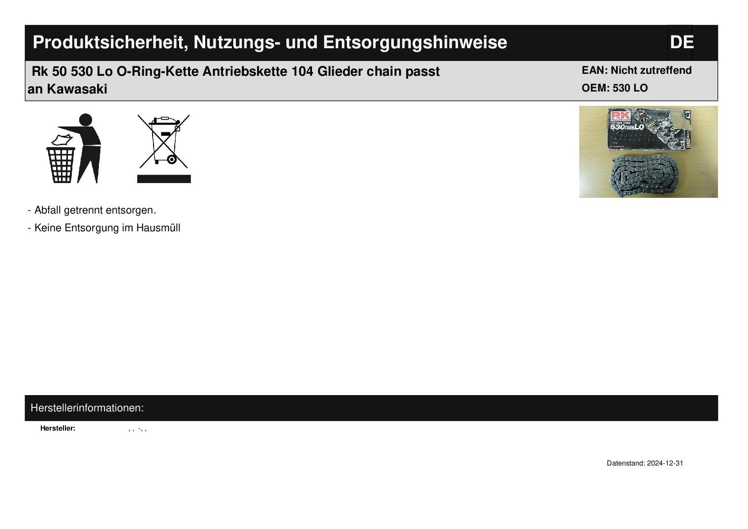 In dieser Auktion gibt es folgenden Artikel zu kaufen: O-Ring-Kette (siehe Foto) Typ: 530 LO Gliederzahl: 104 Lieferumfang: Kette, geschlossen ohne Kettenschloss Artikelzustand: neu aus Geschäftsauflösung, Verpackung kann beschädigt sein