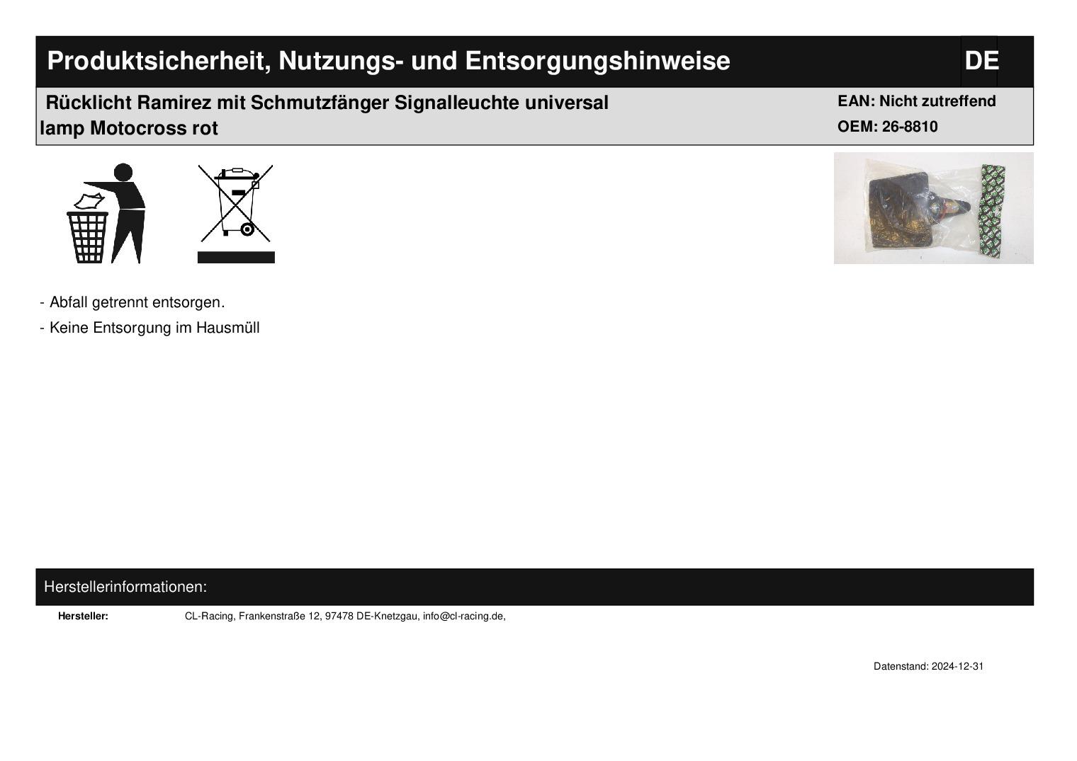 In dieser Auktion gibt es folgenden Artikel zu kaufen: Rücklicht mit Schmutzfänger (ähnlich Foto) Modell: universal Bj.: unbekannt Lieferumfang: 1 Stück Artikelzustand: neu aus Geschäftsauflösung, mit minimalen Lagerspuren; Zustand ähnlich Foto Bei Unklarheiten oder Fragen bitte erst E-Mail schreiben.