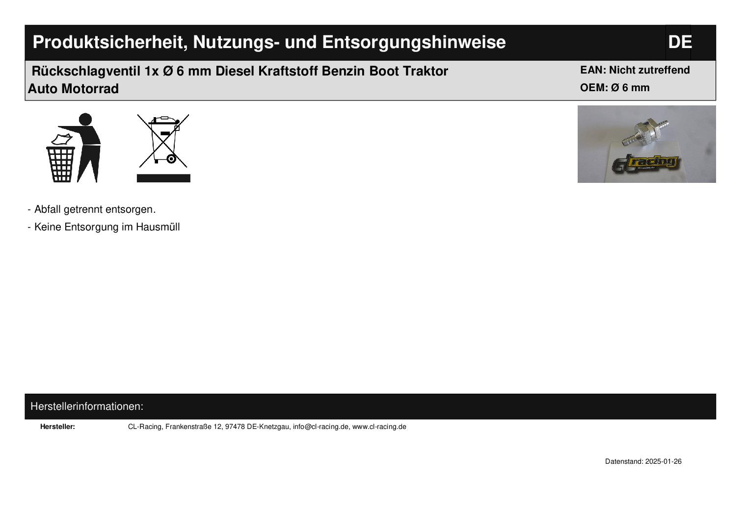 Rückschlagventil (siehe Foto) Modell: unbekannt Artikelbeschreibung: verhindert den Rücklauf und Rückschlag von Flüssigkeiten, Fetten, Ölen, Benzin oder Gas Maße: Gesamtlä nge: ca. 54 mm Anschlusslä nge: ca. 18 mm Anschlussdurchmesser: 6 mm technische Daten: Arbeitsbereich: 0 - 6 bar Öffnungsdruck: 0,2 bar Arbeitstemperatur: -30°C - 130°C Lieferumfang: 1 Stück Artikelzustand: neu Bei Unklarheiten oder Fragen bitte erst E-Mail schreiben.