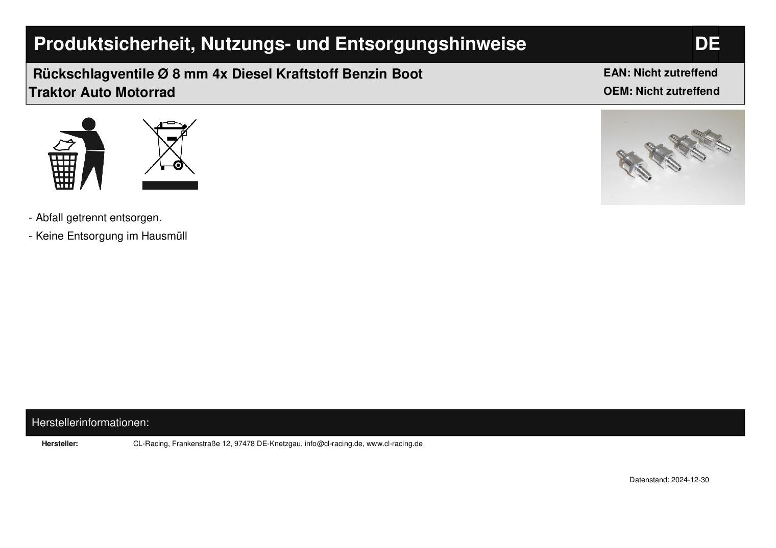 Rückschlagventile (ähnlich Foto) Artikelbeschreibung: verhindert den Rücklauf und Rückschlag von Flüssigkeiten, Fetten, Ölen, Benzin oder Gas Material: Aluminium Maße: Gesamtlänge: 60 mm Anschlusslänge: ca. 18 mm Anschlussdurchmesser: Ø 8 mm Arbeitsbereich: 0 - 5 bar Öffnungsdruck: 0,2 bar Lieferumfang: 4 Stück Artikelzustand: neu Bei Unklarheiten oder Fragen bitte erst E-Mail schreiben.