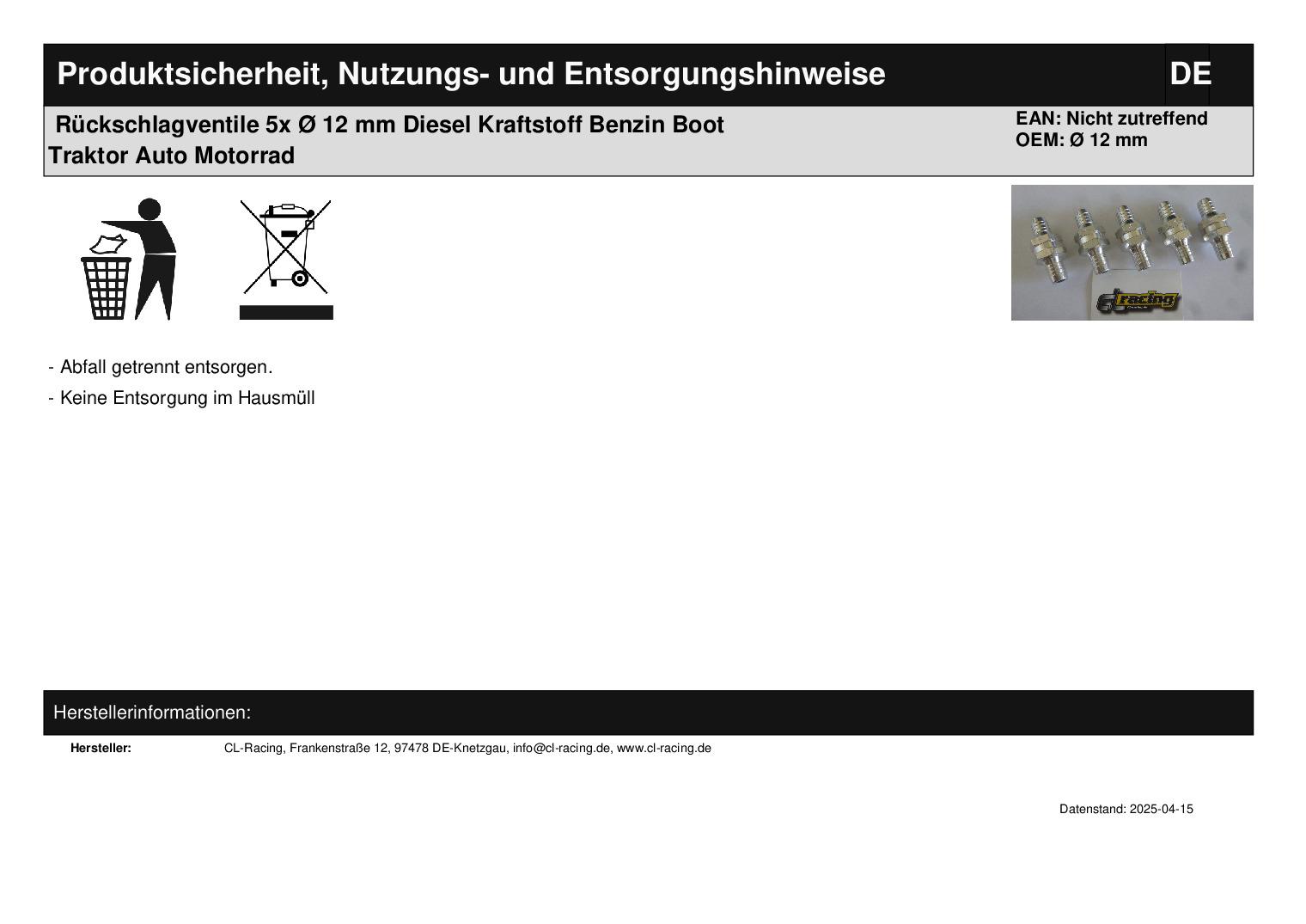 Rückschlagventile (siehe Foto) Modell: unbekannt Artikelbeschreibung: verhindert den Rücklauf und Rückschlag von Flüssigkeiten, Fetten, Ölen, Benzin oder Gas Maße: Gesamtlä nge: ca. 53 mm Anschlusslä nge: ca. 18 mm Anschlussdurchmesser: 12 mm technische Daten: Arbeitsbereich: 0 - 5 bar Öffnungsdruck: 0,2 bar Lieferumfang: 5 Stück Artikelzustand: neu Bei Unklarheiten oder Fragen bitte erst E-Mail schreiben.