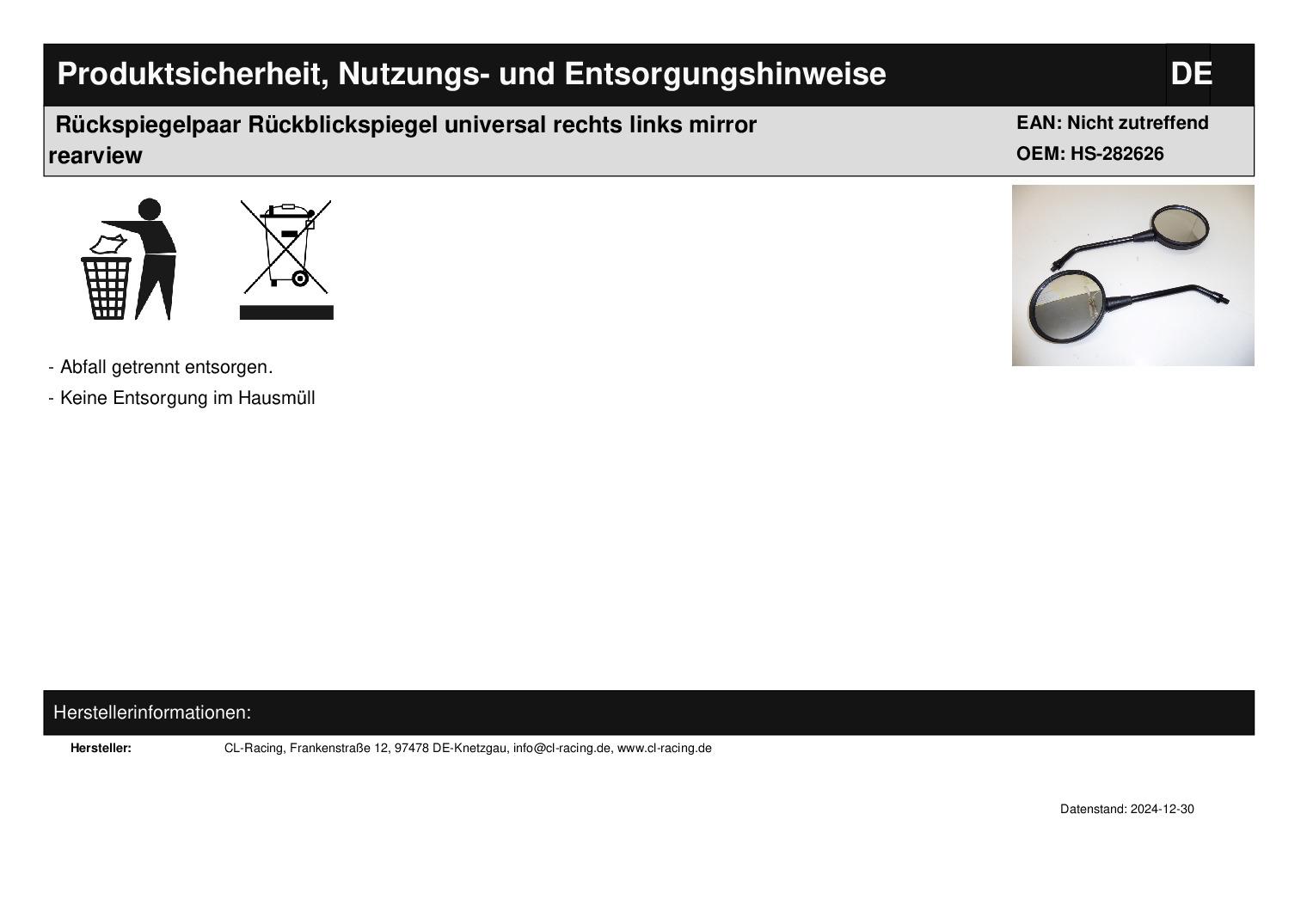 In dieser Auktion gibt es folgenden Artikel zu kaufen: Spiegelpaar universal (siehe Foto) Artikelbeschreibung: Länge gesamt: ca. 335 mm Armlänge: ca. 165 m Glasdurchmesser: ca. 110 mm E-geprüft Lieferumfang: siehe Foto Artikelzustand: neu aus Geschäftsauflösung, mit minimalen Lagerspuren; Zustand siehe Foto Bei Unklarheiten oder Fragen bitte erst E-Mail schreiben.